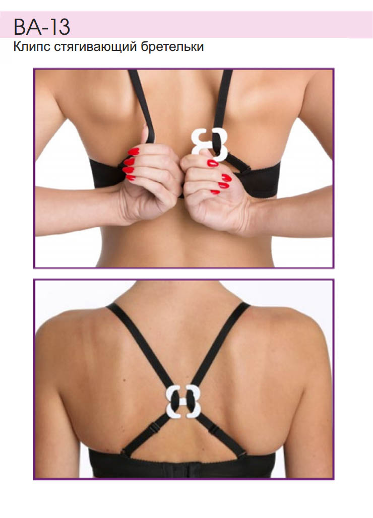 Клипс стягивающий дает возможность скрыть бретели при носке вещей с большим вырезом. Клипс можно свободно передвигать вверх и вниз.