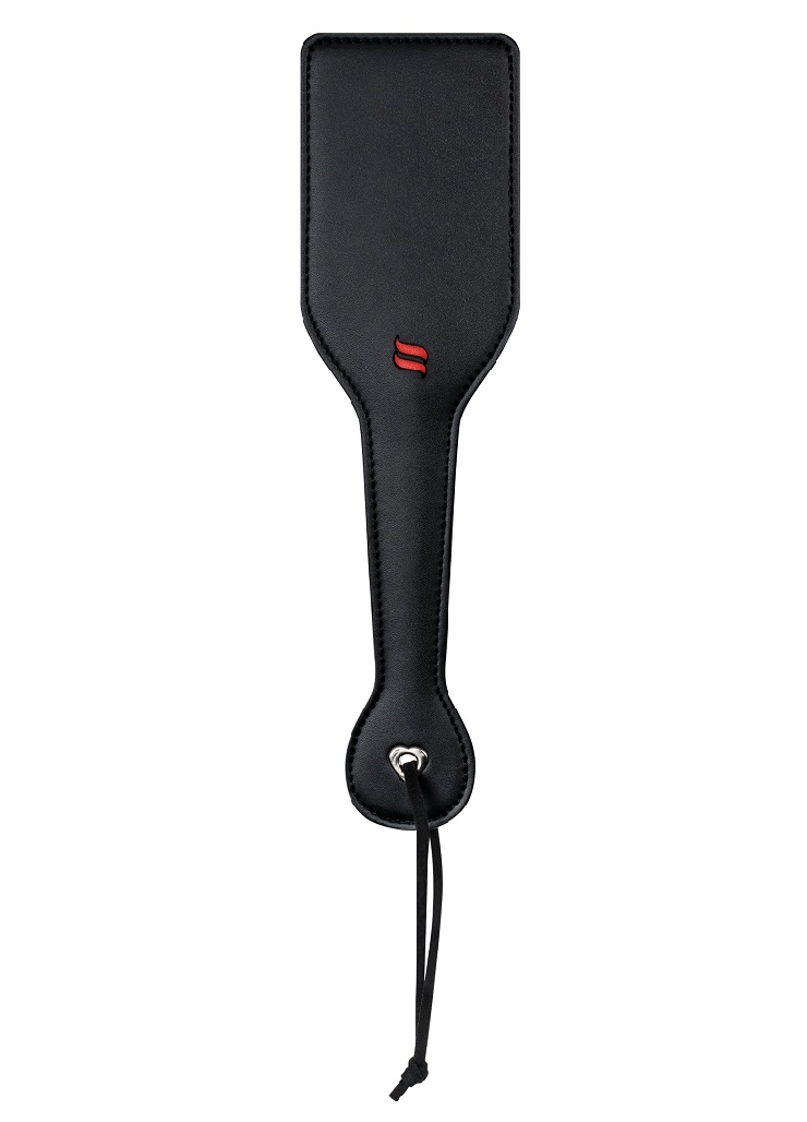 Стек для эротических игр в классическом дизайне. Черная шлепалка изготовлена из высококачественного ПВХ с удобной ручкой и шнурочком для запястья.