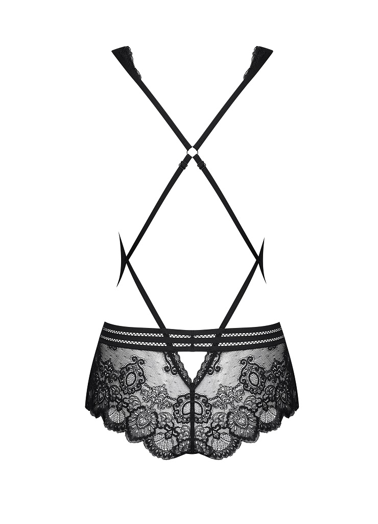 Необычное черное боди 853 от европейского производителя Obsessive. Широкие кружевные полосы плавно переходят в шортики. Открытая спина украшена тонкими пересекающими, регулируемыми бретелями. Кружевны шортики с маленьким разрезиками по бокам.