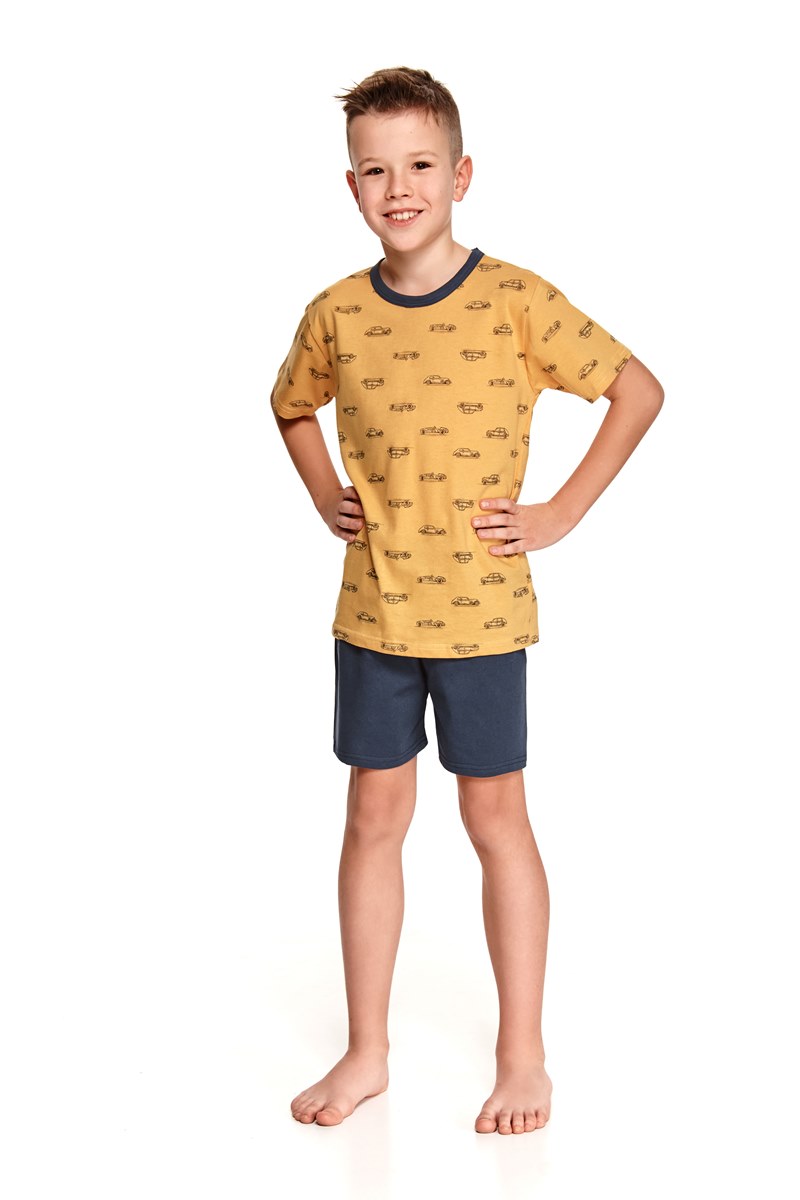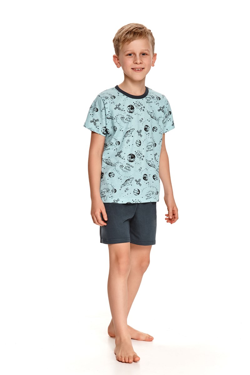 Детская хлопковая пижами для мальчика. Футболка с коротким рукавом и круглым вырезом горловины, декорирована принтом. Однотонные шорты с эластичной резинкой на поясе и двумя боковыми карманами.