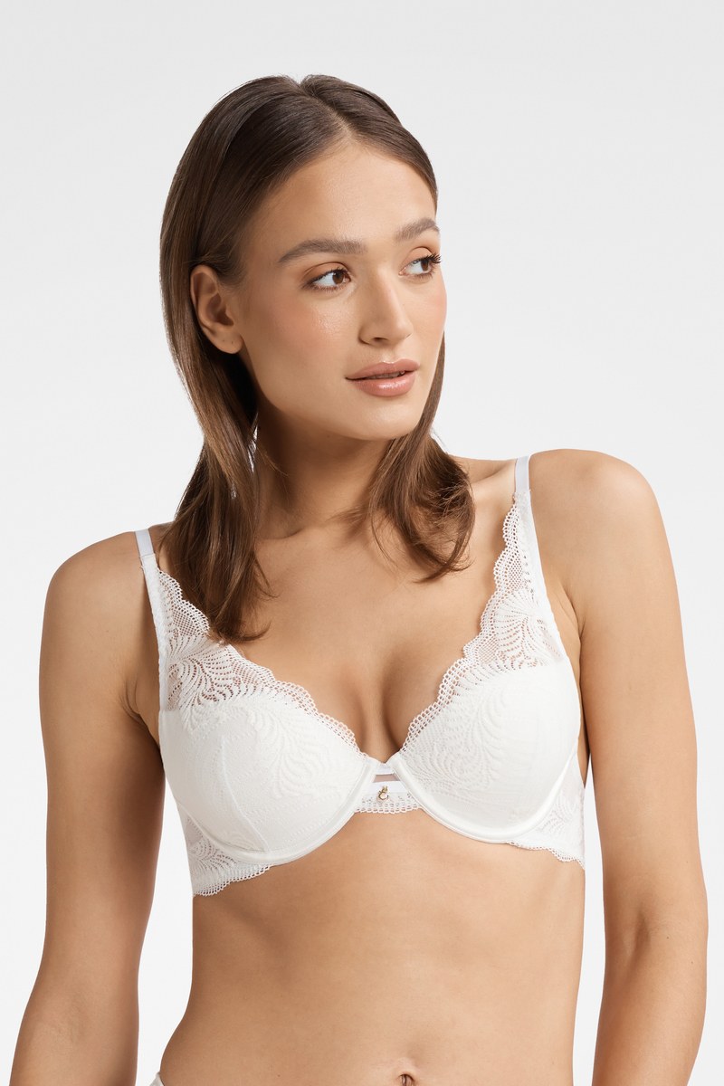 Бюстгальтер KHLOE от европейского производителя Esotiq. Кружевной бюстгальтер с небольшим пуш-ап на кости. С глубоким декольте. Несъемные регулируемые бретели. Трухступенчатая застежка на крючки. Сетка: 94% полиамид, 6% эластан Кружево: 83% полиамид, 17% эластан Подклад чашки: 100% хлопок