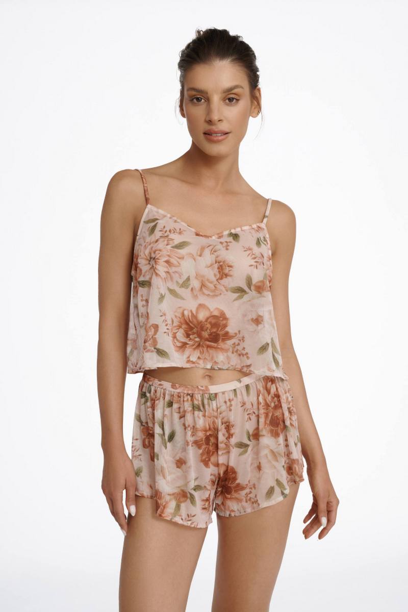 Комплект женский с короткими шортами. Топ на тонких регулируемых бретелях. Выполнен из микросетки.