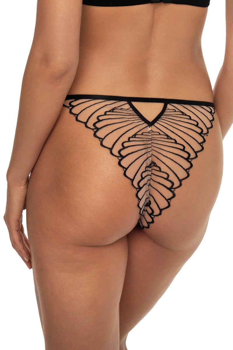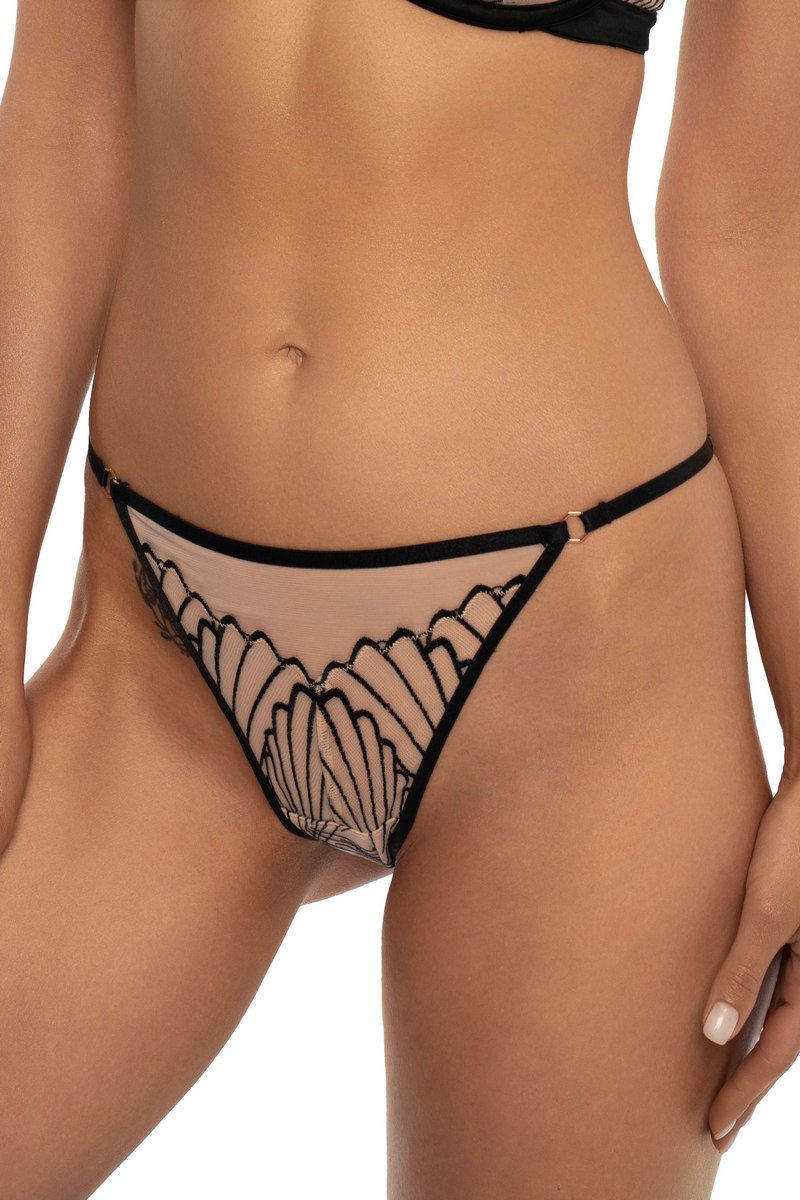 Трусы слипы из микросетки с вышивкой. Декоративный стреп на поясе с золотым аксессуаром. Ластовица хлопковая. Основной состав: 70% полиамид, 30% полиэстер Сетка: 84% полиамид, 16% эластан