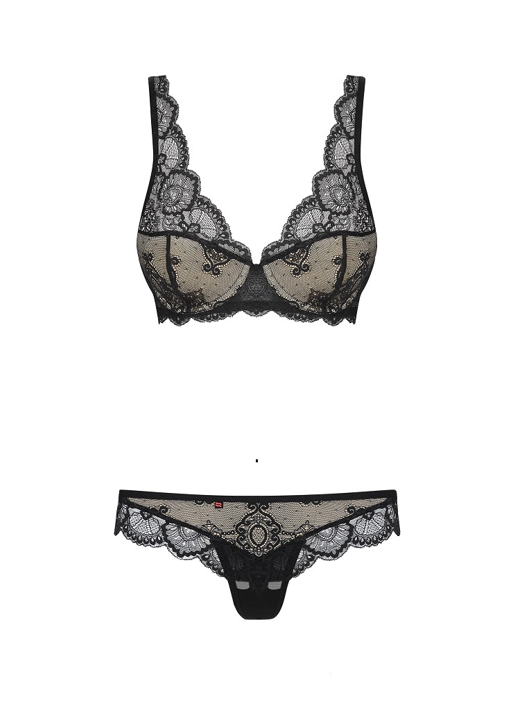Фантастический комплект 853 от европейского производителя Obsessive. Мягкий кружевной бюстгальтер с широкими бретелями, плавно переходящими в чашечки с дополнительной бежевой подкладкой. Сзади бретели регулируются по длине. Кружевные стригни с бежевой подкадкой в передней части.