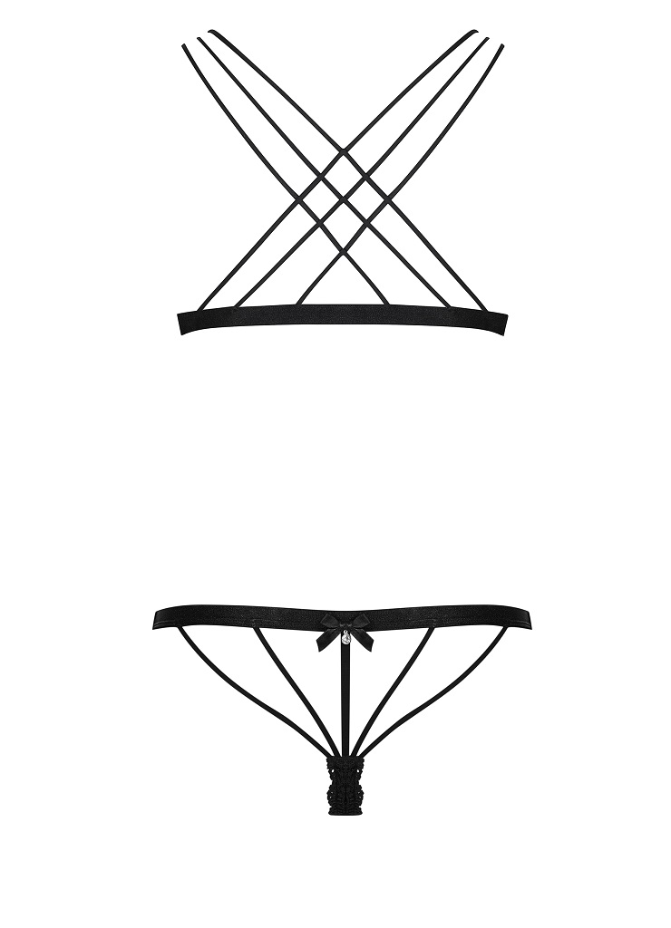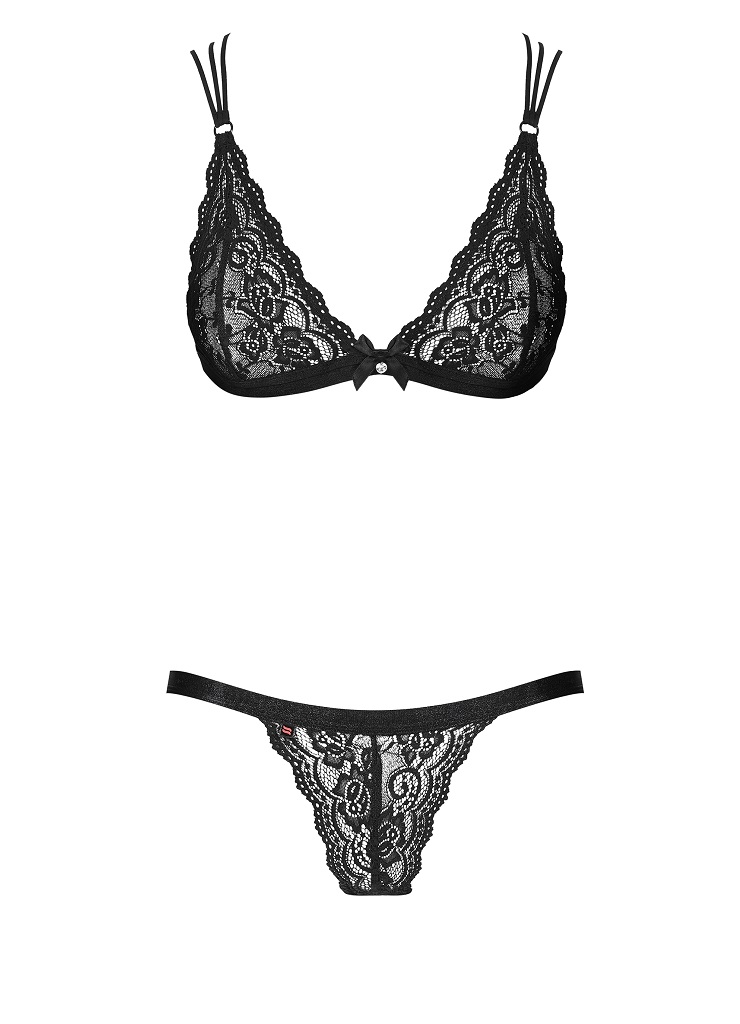 Соблазнительный кружевной комплект 854 от европейского производителя Obsessive. Сексуальный бюстгальтер с мягкими, кружевными чашками и тонкими бретелями, пересекающими на спине. Пикантные трусики-стринги из кружева спереди и эластичных полосок на ягодицах.