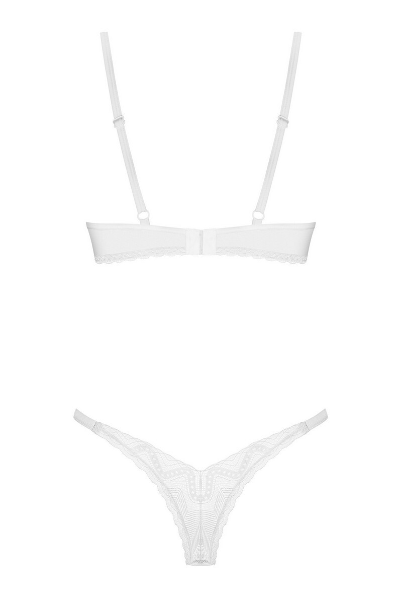 Этот комплект белого кружевного белья плавно переходит от дневной элегантности к интимному вечернему очарованию и идеально подходит как для рабочих будней, так и для романтических свиданий. Разработан в ЕС. Не содержит никеля.