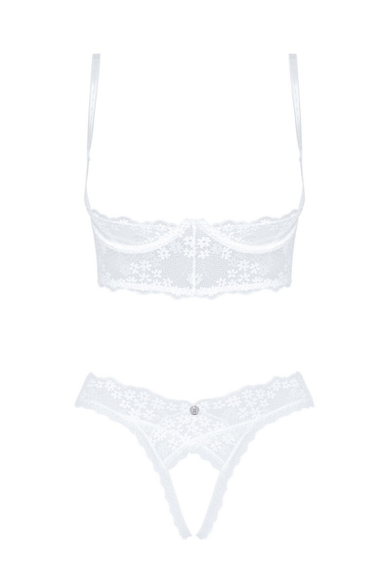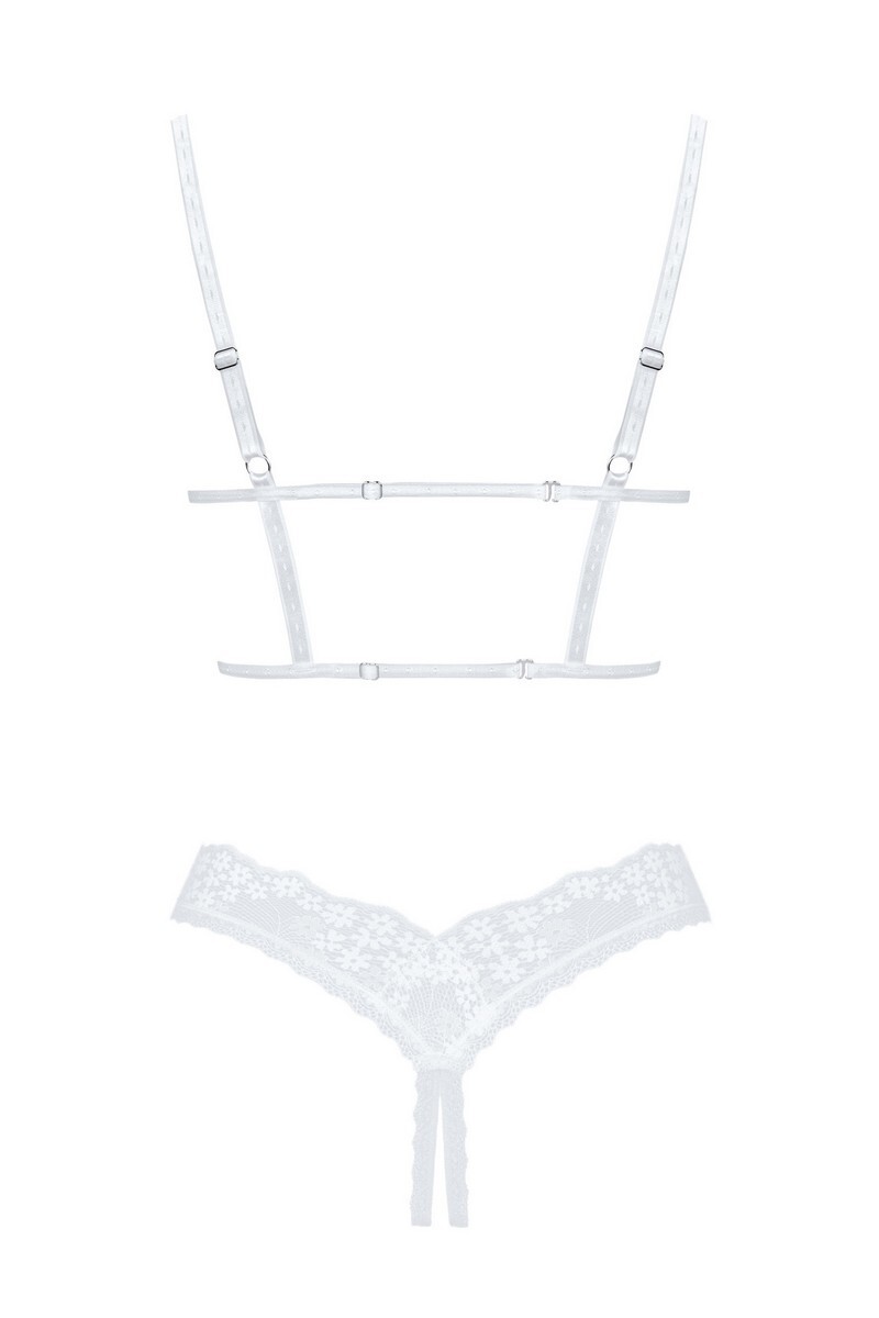 Это правда, что противоположности притягиваются! Очень тонкое белое кружево этого комплекта идеально гармонирует со столь же смелым кроем. Открытые чашечки бюстгальтера и открытые стринги в промежности - идеальное сочетание, которое вам не нужно снимать, чтобы почувствовать себя на небесах. Комплект включает открытый бюстгальтер и открытые стринги – еще больше удовольствия. Чашечки на косточках создают красивый вид груди. Регулируемые бретельки на спине и плечах для идеальной посадки. Ювелирная подвеска дополняет образ.