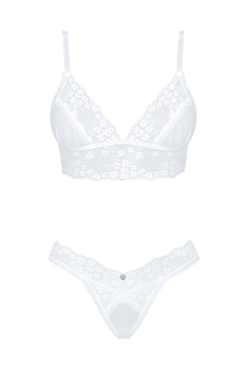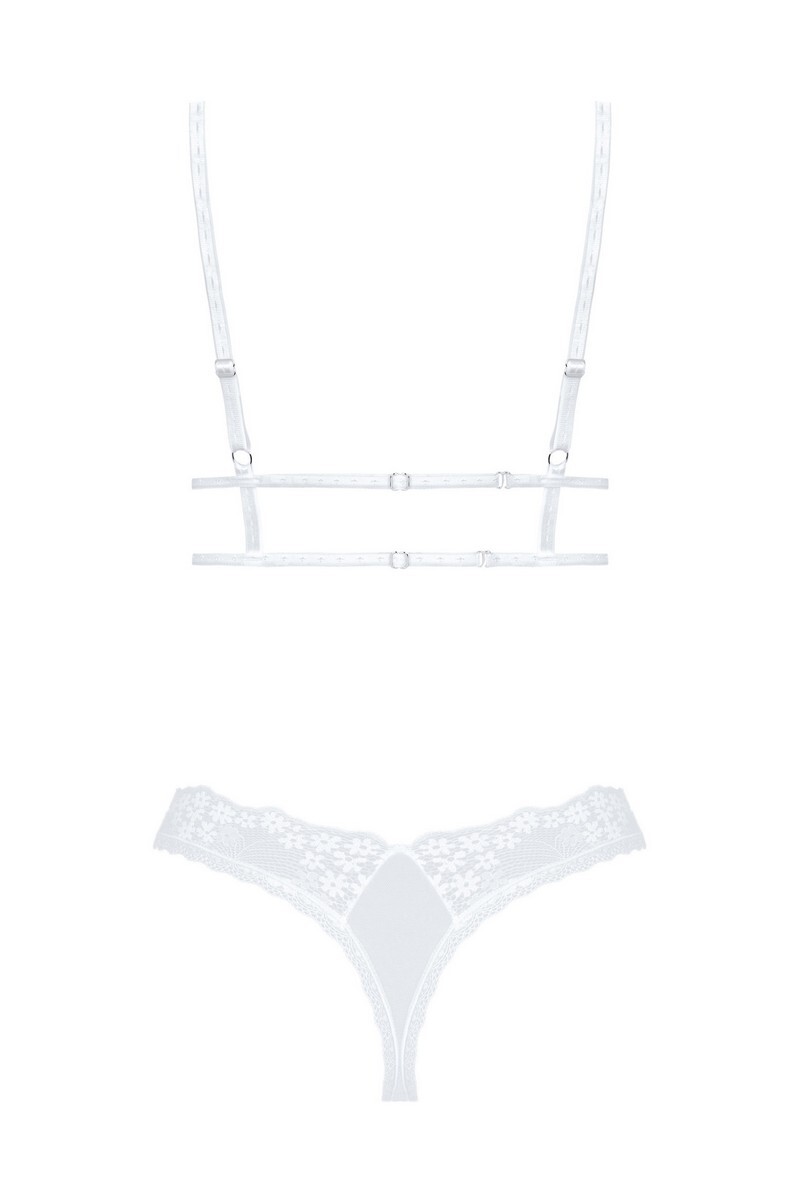 Если вы ищете уникальное нижнее белье для особого случая, этот комплект - поистине подарок небес! Нежная полупрозрачная сетка с вышитыми крошечными цветами покорит ваше сердце. Комплект Heavenlly состоит из треугольных мягких чашечек, расширенной талии под грудью (ярусная линия) и соблазнительных стрингов. Обязательно обратите внимание на более пикантную, открытую версию этого комплекта. Регулируемые бретельки на плечах и спине – для идеальной посадки. Блестящая подвеска – элегантный аксессуар.