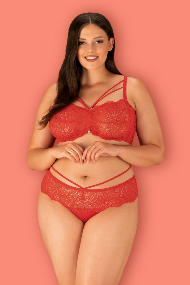 Игривый комплект, придающий пикантности. Нежный акцент на бедра и элегантно подчеркнутые грудь и ягодицы. Очаровательный бюстгальтер и трусики стринги огненно-красного цвета, регулируемые бретели, многоступенчатая завтежка - идеальная посадка, металлический кулон с легким блеском.