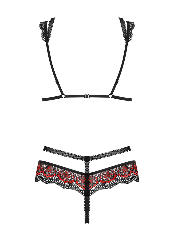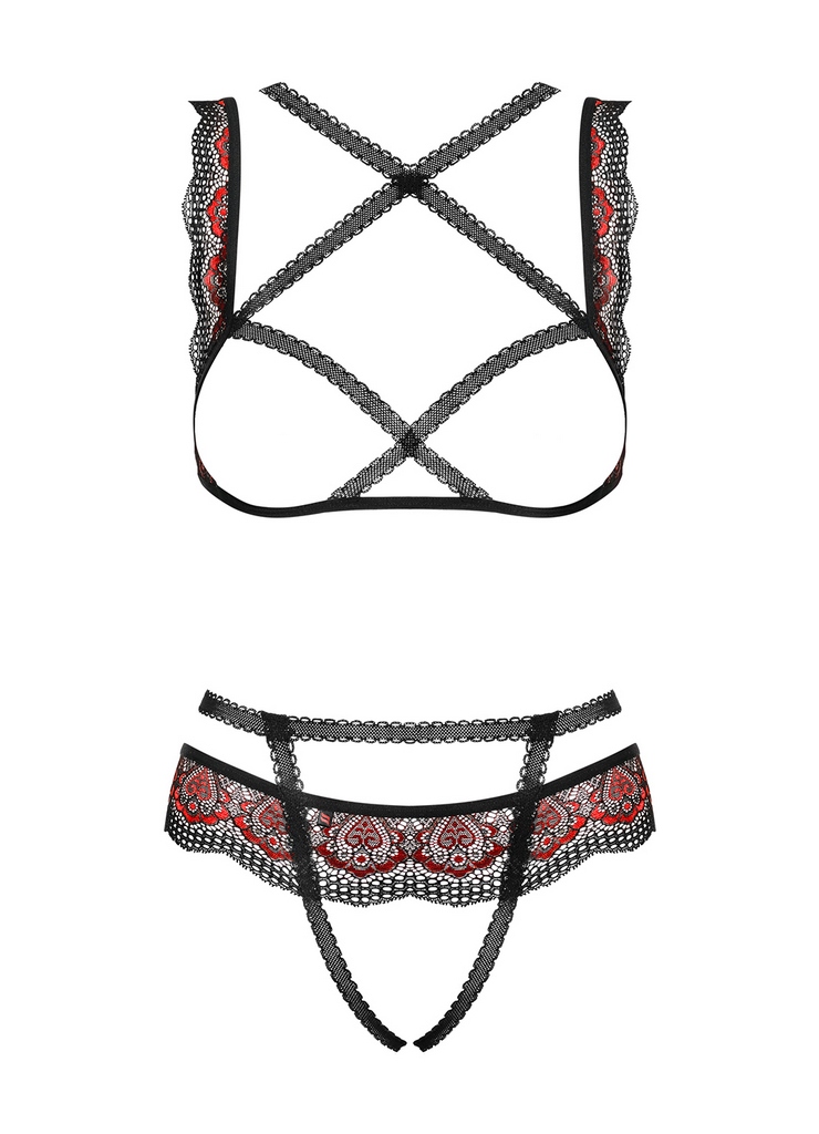 Роскошный комплект из коллекции Megies: Бюст из тонких союзок с открытой грудью, на тонких регулируемых по длине бретельках, на спине застежка. Трусики-стринги высокие с открытой ластовицей.