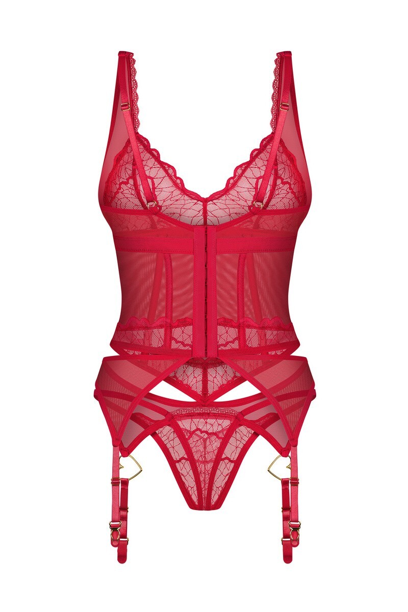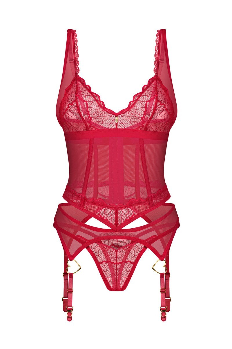 Соблазнительный комплект нижнего белья, который украсит любую интимную встречу. Красный корсет и стринги Cupide Desir сочетают в себе комфорт и чувственный внешний вид. Прозрачная сетка, мягкое кружево и золотые детали в форме сердца завораживают. Широкие регулируемые бретели и встроенные подвязки обеспечивают безупречную и комфортную посадку, а вертикальная застёжка на крючках сзади надёжно фиксирует всё на месте. Ткани премиум-класса, коплект разработан в ЕС.