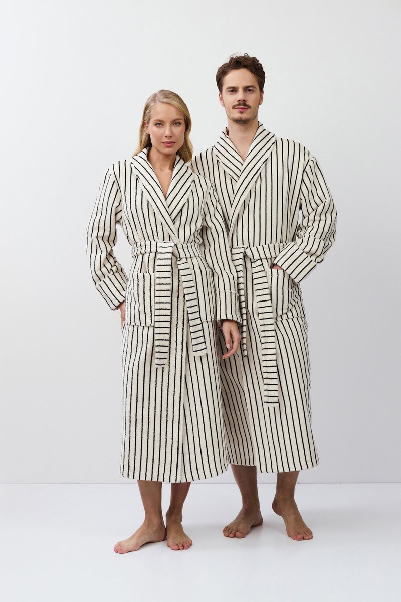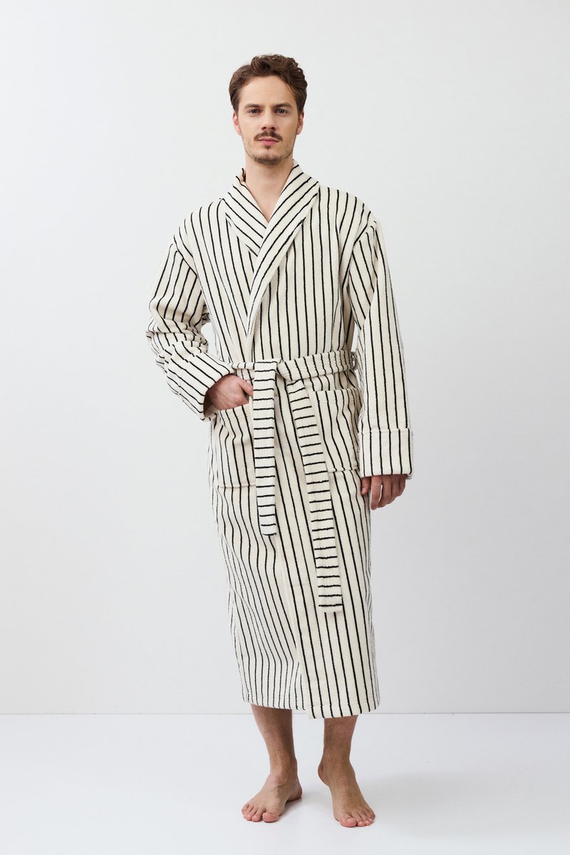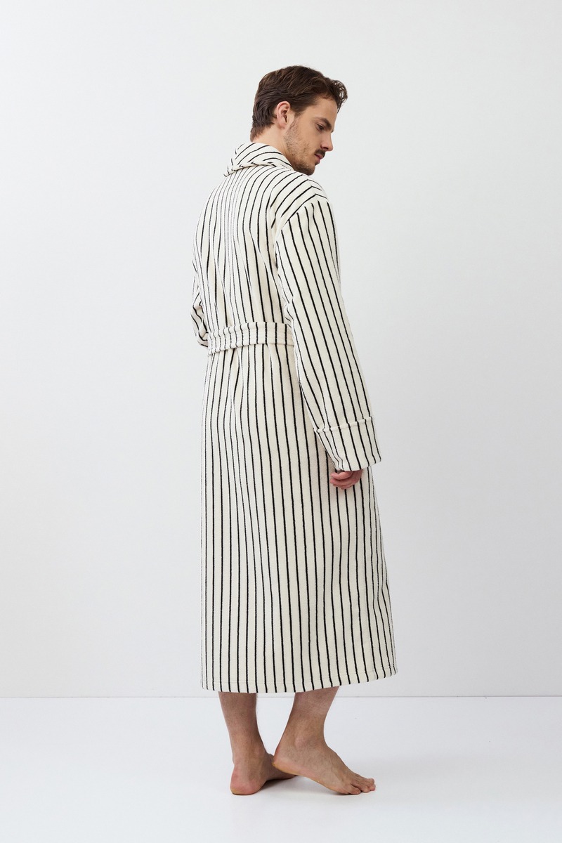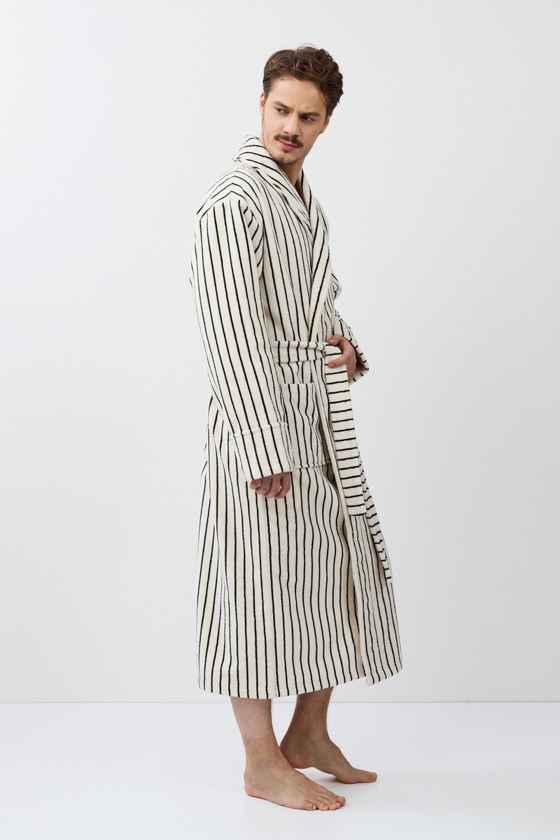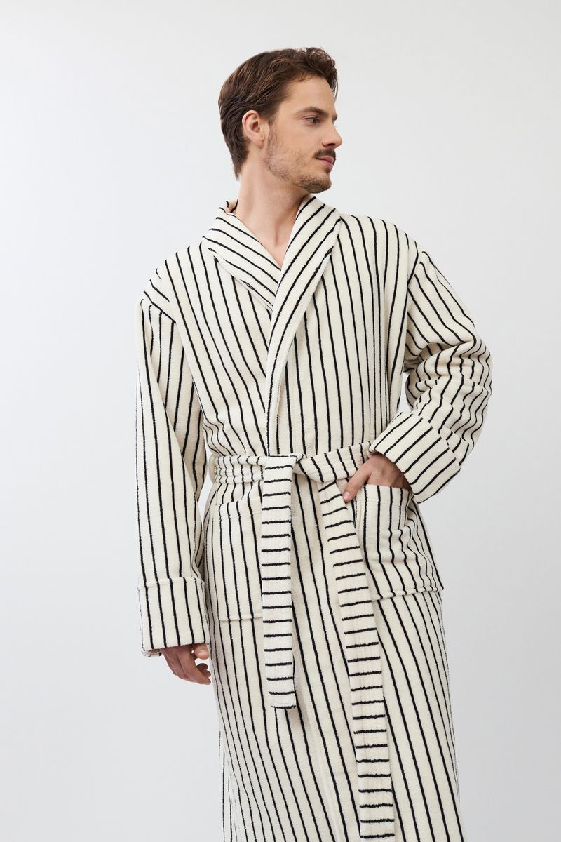 Длинный мужской халат LANA окутывает вас и подарит уют. Изготовлен из плотной махровой ткани в полоску. Имеется пояс и накладные карманы. Рукава длинные. Халат станет вашим идеальным спутником в моменты расслабления.
