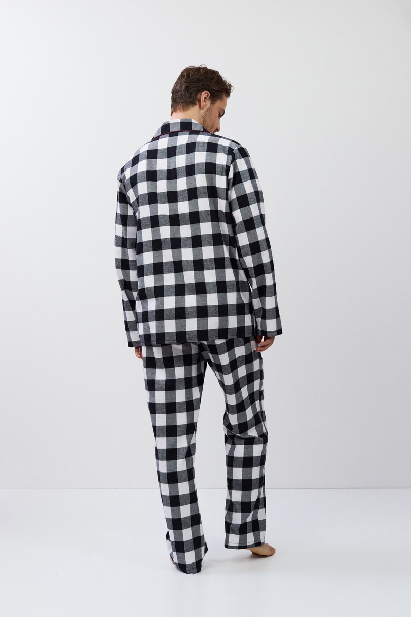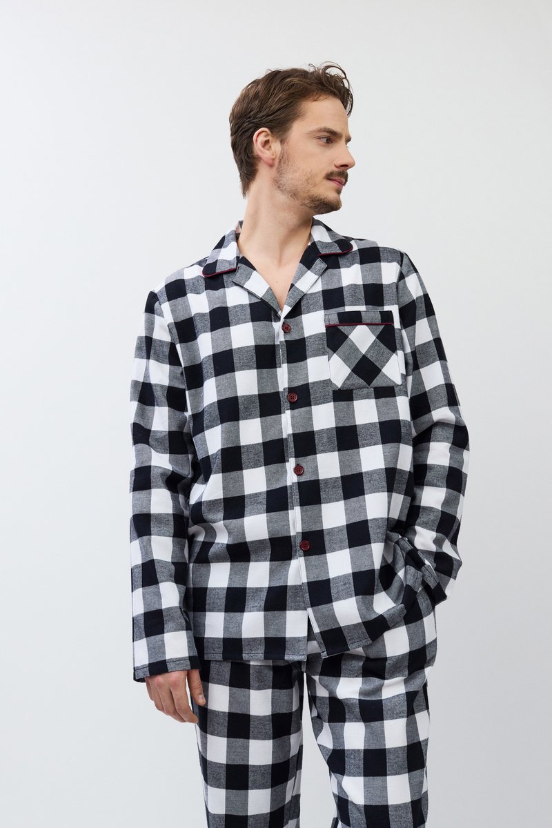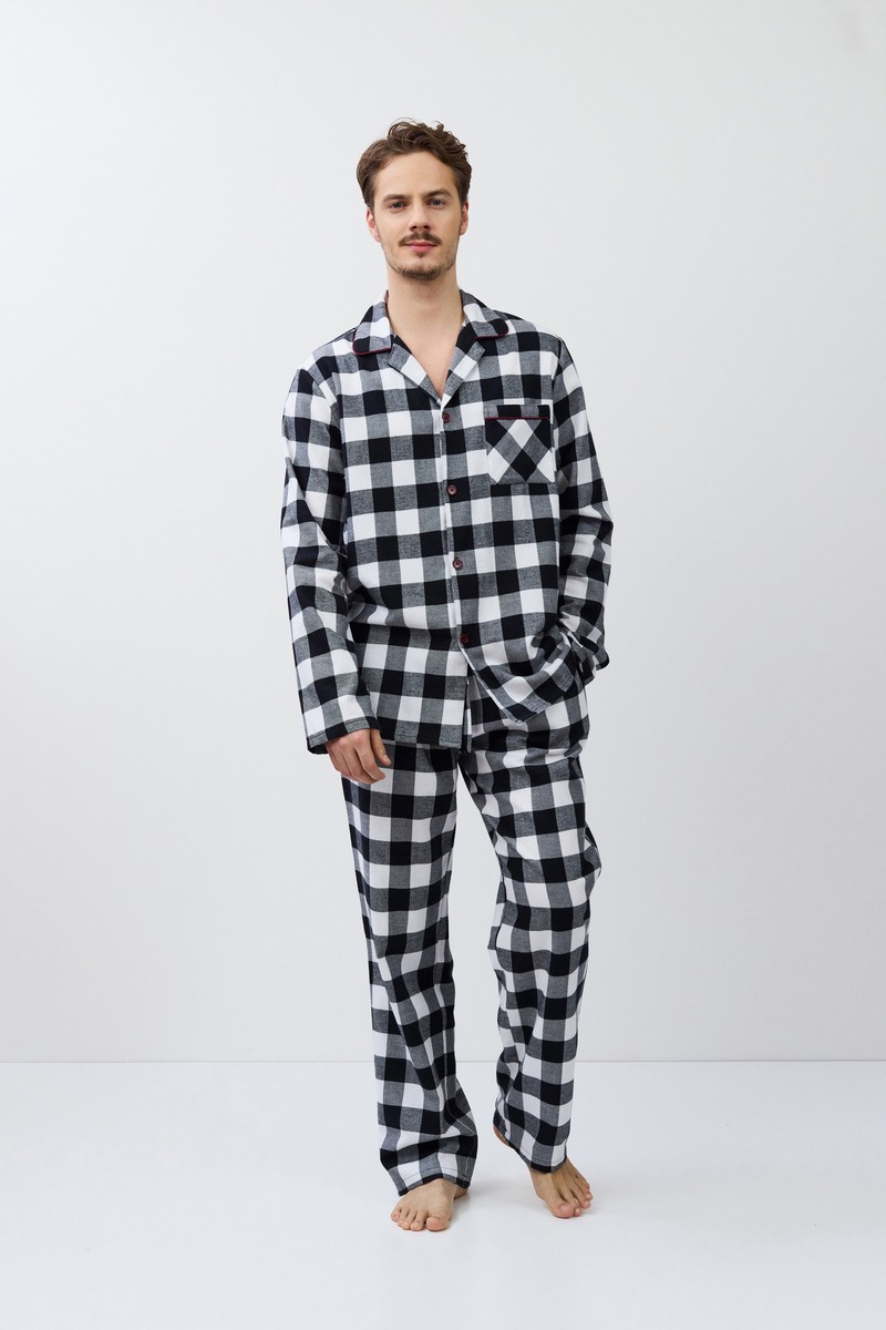 Пижама мужская со штанами ADRIAN для вашего ночного комфорта. Пижама выполнена из хлопковой фланели. Рубашка на пуговицах, с длинными рукавами, отложным воротником и нагрудным карманом. Штаны длинные, свободной формы, с эластичным поясом с завязкой и боковыми карманами. Расслабьтесь с максимальным комфортом и стилем в пижаме ADRIAN.