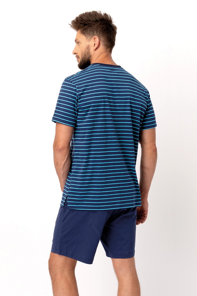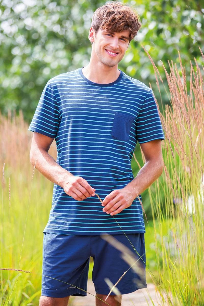 Мужская пижама с футболкой и шортами. Комфортная и приятная на ощупь пижама из 100% хлопка. Футболка с коротким рукавом, нагрудным карманом и круглым вырезом горловины. Комфортные шорты свободного кроя с эластичным поясом. Глубокие карманы по бокам.