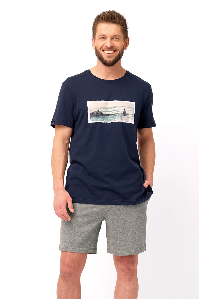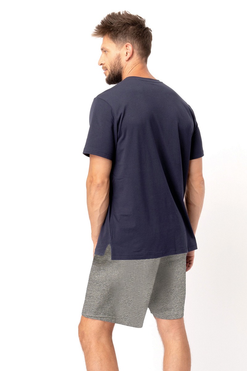 Мужская пижама с футболкой и шортами. Комфортная и приятная на ощупь пижама из 100% хлопка. Футболка с коротким рукавом и круглым вырезом горловины, по бокам разрезы. Комфортные шорты с эластичным поясом. Глубокие карманы по бокам.