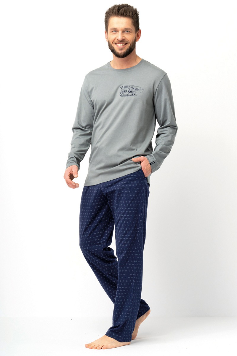 Всесезонная мужская пижама классического кроя. Изготовлено полностью из мягкого, высококачественного хлопкового трикотажа, который обеспечивает комфорт, свободу движений и долговечность. Классический крой верха и низа. Лонгслив с круглым вырезом и мультяшным изображением скачущей лошади. Гладкие брюки слегка зауженного кроя с удобным мягким эластичным поясом и шнурком на талии. Глубокие карманы по бокам. Высококачественные волокна 100% хлопка в сочетании с правильной строчкой и нитками гарантируют исключительную долговечность и позволяют пижаме сохранять форму в течение длительного времени. Мягкий и приятный на ощупь хлопок — идеальный выбор для любого сезона.