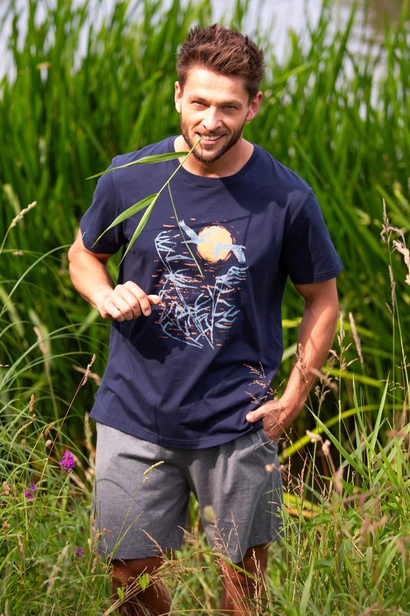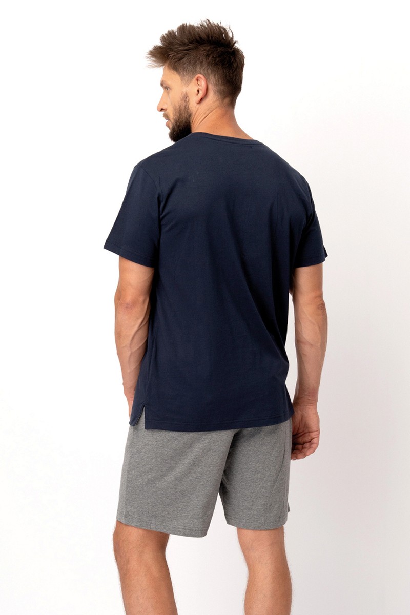 Мужская пижама с футболкой и шортами. Комфортная и приятная на ощупь пижама из 100% хлопка. Футболка с коротким рукавом и круглым вырезом горловины, по бокам разрезы. Комфортные свободные шорты с эластичным поясом. Глубокие карманы по бокам.