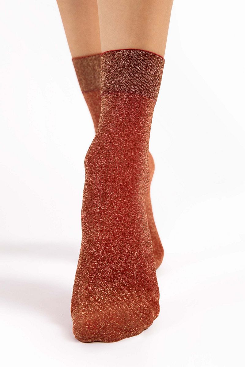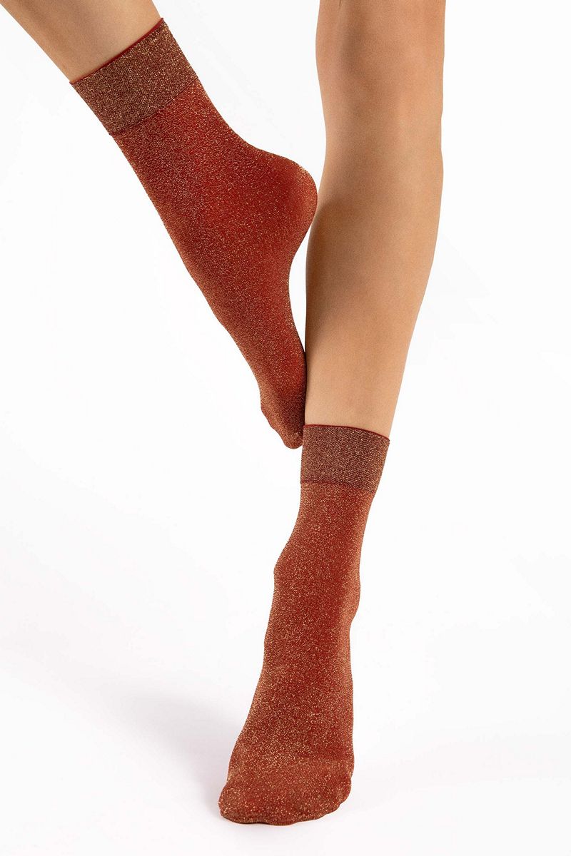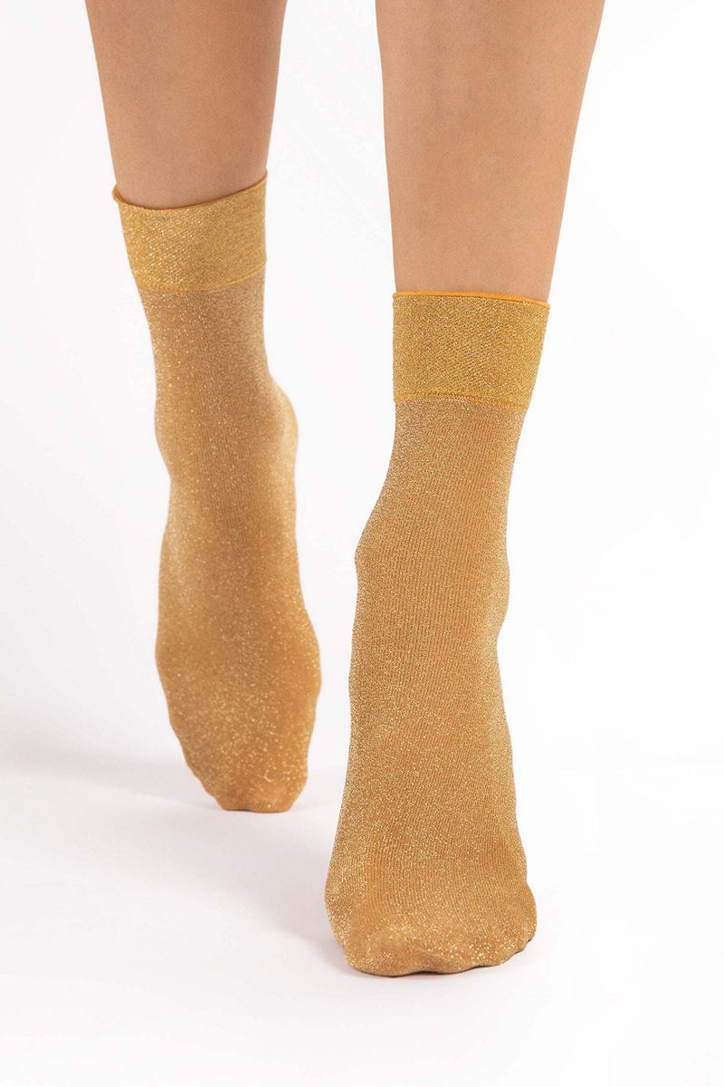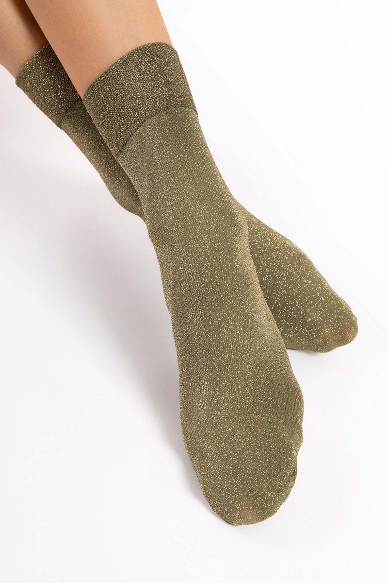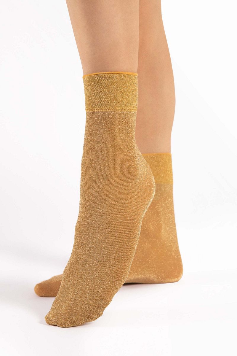 Мерцающие носки изготовлены по 3D-технологии с добавлением золотистого люрекса. Самый праздничный вариант этого сезона. Также подходит для повседневной носки. Блестящие люрексовые носки для любителей гламурного стиля - технология 3D обеспечивает превосходную прочность, гибкость и прилегание к ноге. Удобная, не сдавливающая манжета и невидимо укреплённый носок. Пряжа от ведущих европейских поставщиков.
