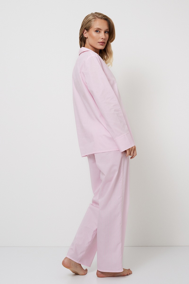 Представляем вам пижаму с шортами Amorette — незаменимое дополнение к вашей коллекции ночного белья, сочетающее в себе комфорт и неподвластную времени элегантность. Комплект из лёгкого дышащего хлопка с восхитительным рисунком в светло розово-белую полоску излучает игривое очарование. Рубашка на пуговицах с длинными рукавами имеет изысканный V-образный вырез, дополненный изящной окантовкой вдоль воротника, спереди и U-образного нагрудного кармана. Задняя часть украшена замысловатой вышивкой в виде короны. Шорты с боковыми разрезами, поясом, боковыми вставками и практичными карманами. Этот комплект — идеальное сочетание стиля и функциональности для уютных вечеров дома.