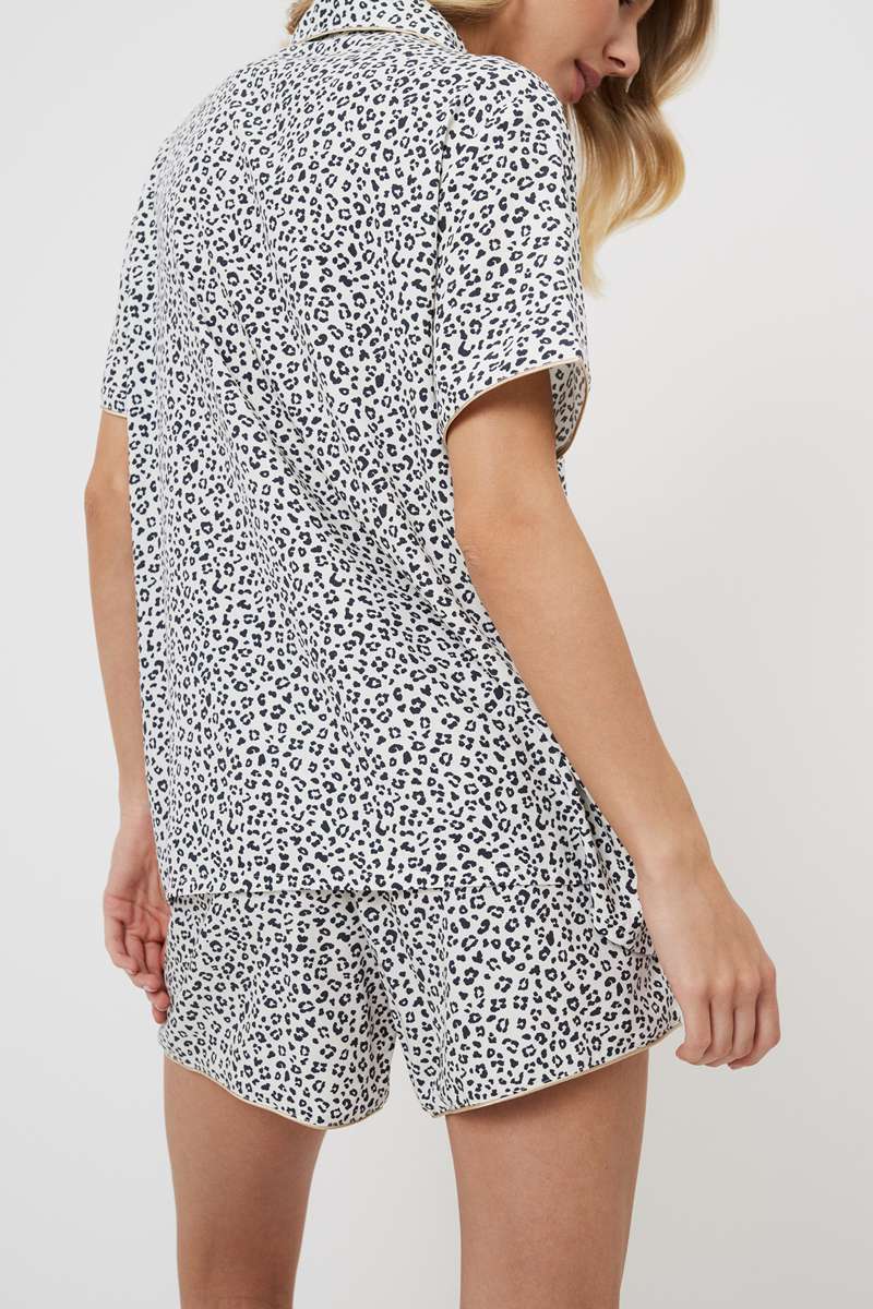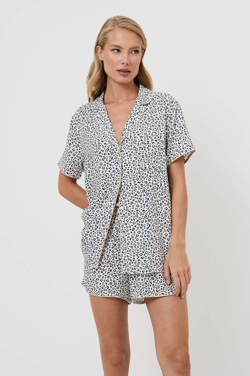 Представляем вашему вниманию пижаму с шортами Beatrich — воплощение безумной мечты. Изготовлена из лёгкой вискозы с шикарным серым леопардовым принтом. Рубашка на пуговицах с короткими рукавами, окантовкой на манжетах и V-образным вырезом. Шорты с поясом-завязкой, украшены коричневой лентой и окантовкой по бокам. Этот комплект излучает необузданное очарование. Дайте волю своему воображению в наших коротких пижамных шортах Beatrich, которые идеально подходят для тех, кто не боится мечтать.