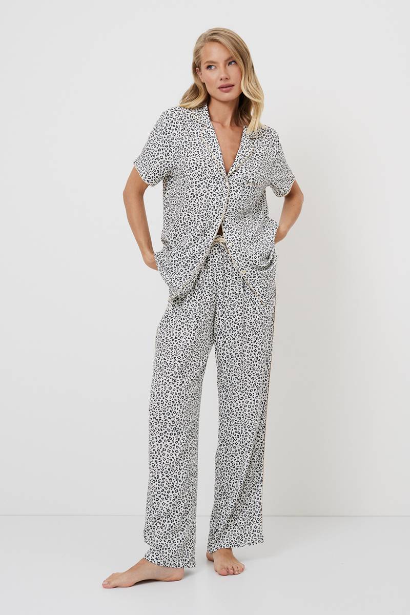 Представляем вашему вниманию длинную пижаму Beatrich — воплощение безумной мечты. Изготовлена из лёгкой вискозы с шикарным серым леопардовым принтом. Рубашка на пуговицах с короткими рукавами, манжетами и V-образным вырезом. В сочетании с брюками в тон с обычным поясом, украшенным коричневой лентой и боковыми манжетами, этот комплект излучает необузданное очарование. Дайте волю своему воображению в нашей длинной пижаме Beatrich, которая идеально подойдёт тем, кто не боится мечтать.