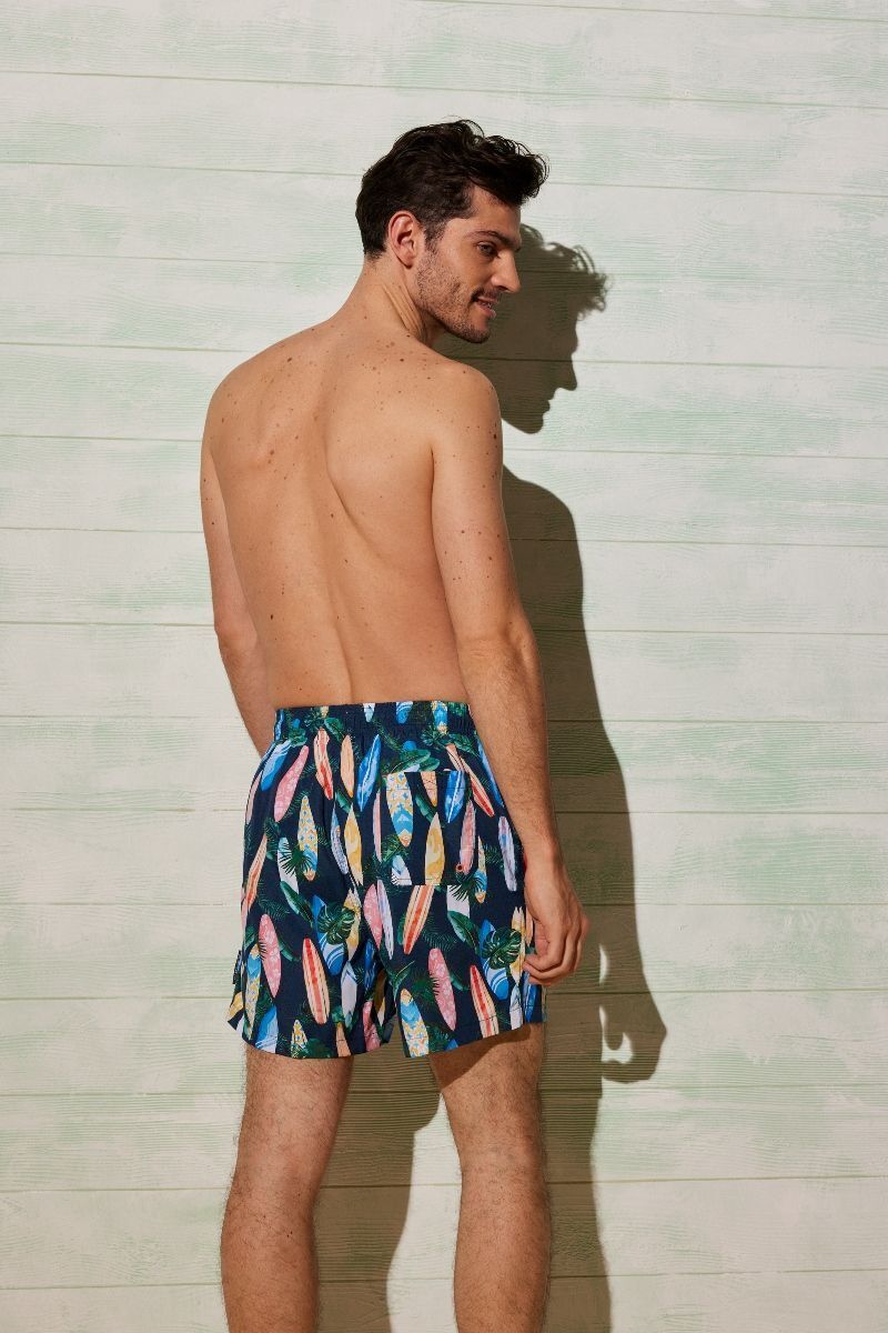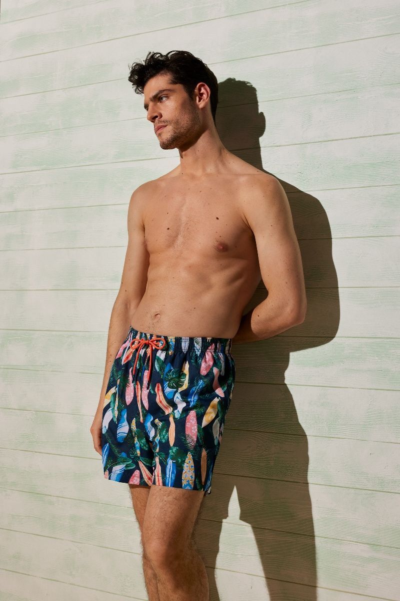 Мужские купальные шорты средней длины от Ysabel Mora. Изделие на завязках, с боковыми и задним карманами, выполнено из облегченной быстросохнущей ткани.