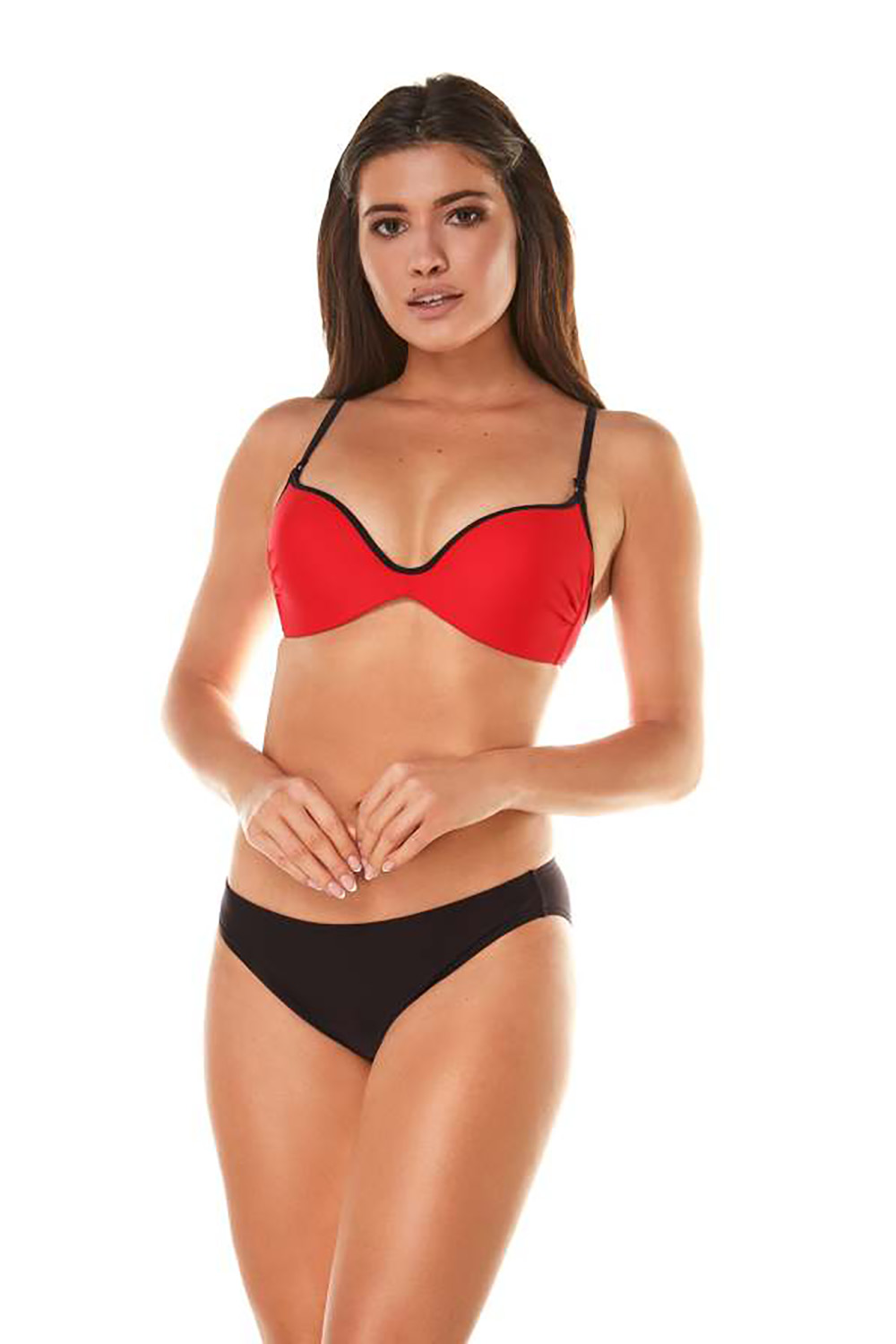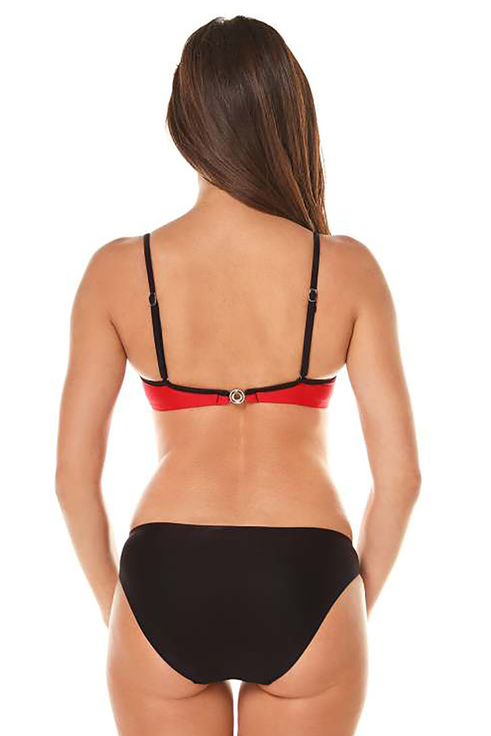 Раздельный купальник A.8066 с формованными чашками пуш-ап на каркасах. Лиф яркого красного цвета с застежкой на спинке, бретели регулируются по длине. Плавки черного цвета с низкой посадкой.
