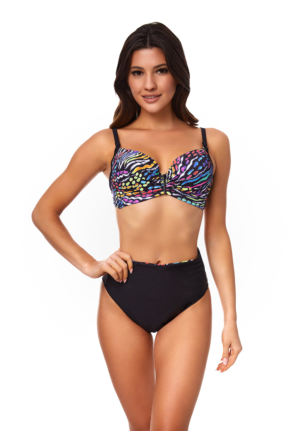 Раздельный купальник D.7213 с формованными чашками push-up на каркасах. Бретели регулируются по длине, на спине нерегулируемая застежка. Плавки с поясом-отворотом, который трансформирует плавки, визуально меняя облик модели. Купальник декорирован цветочным принтом.