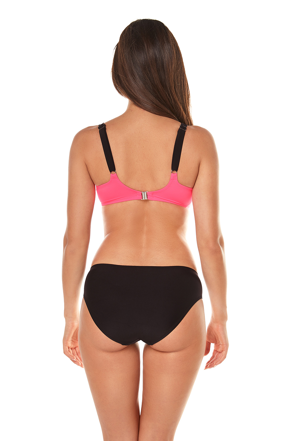 Раздельный купальник D.8051 с твердыми формованными чашками на косточках (, размеры 40D-44F идут со съемным вкладышем push-up), . Бретели регулируются по длине, на спине нерегулируемая застежка. Лиф розового цвета, декорирован эластичными лентами. Плавки черного цвета со средней посадкой.