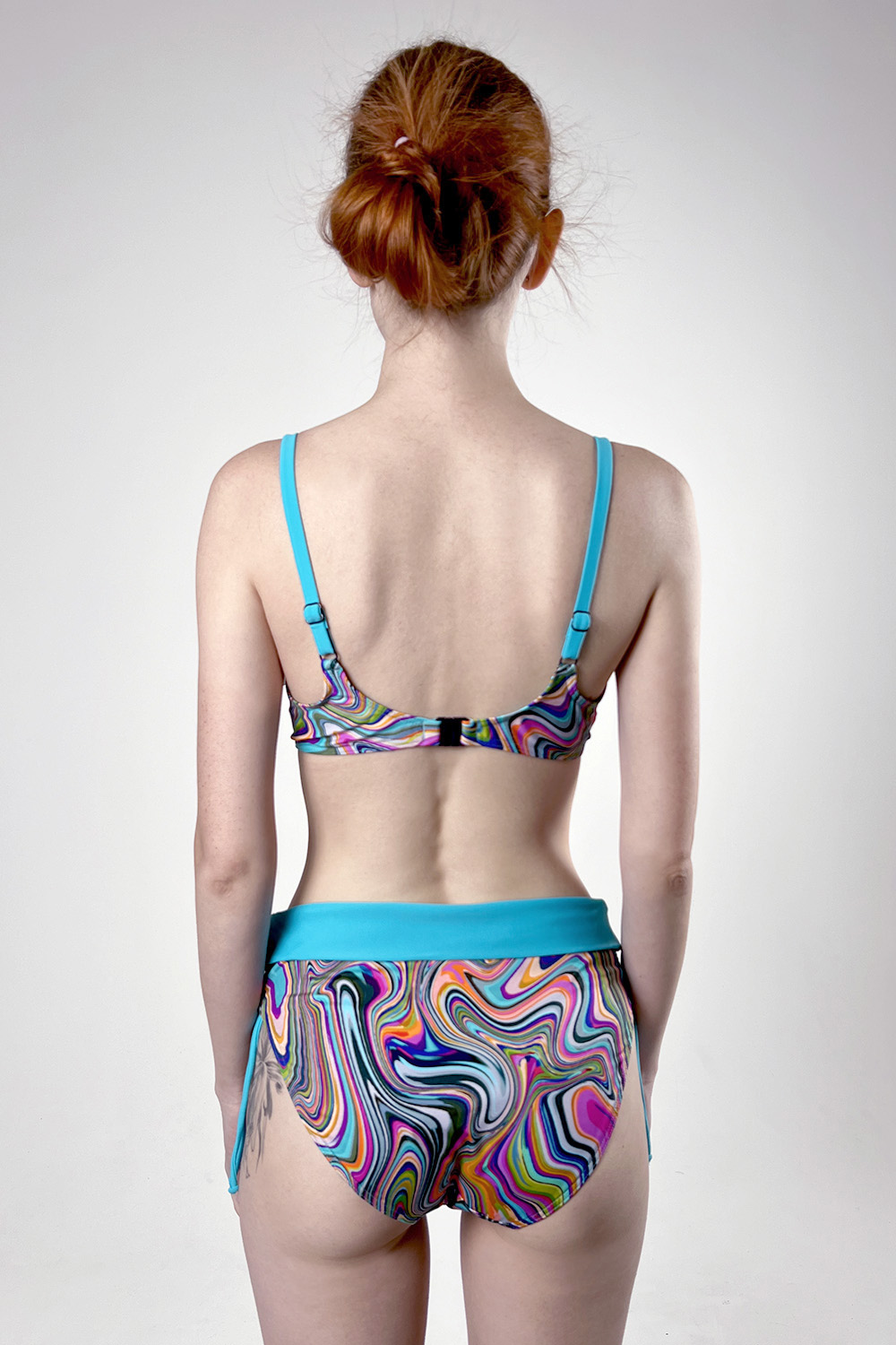Раздельный купальник Fernanda лазурного цвета с ярким разноцветным принтом. В размерах 38-42 идет уплотненная формованная чашка на косточках, в размерах 44-48 идет формованная чашка на косточках с вкладышами push-up. Лиф с боковой поддержкой, бретели регулируются по длине, пластиковая застежка на спине не регулируется. Плавки с завязками для регулировки обхвата, линия талии может изменяться за счет отворота в виде широкого пояса. Лиф и плавки продублированы подкладкой.