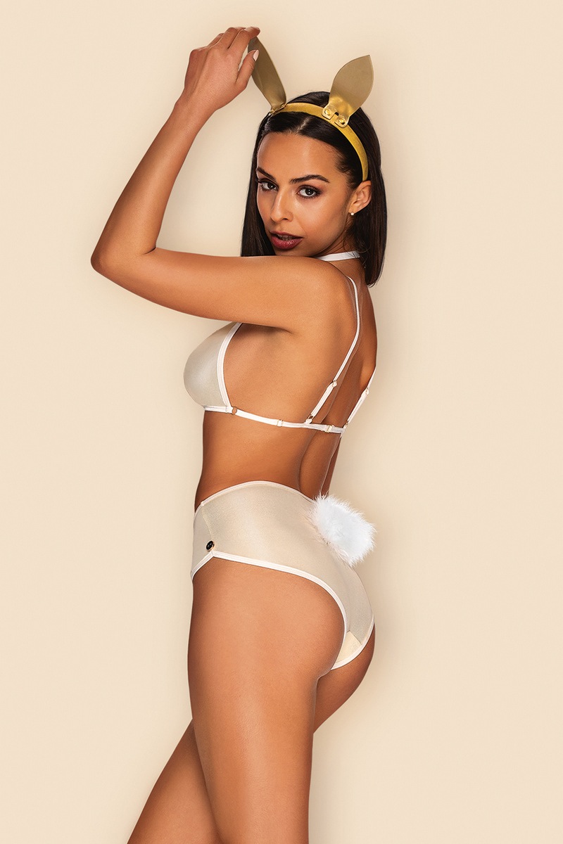 Озарной костюм NEO GOLDES от европейского производителя Obsessive. Набор включает в себя лиф, трусики-шорты с хвостиком, заячьи ушки и эластичное колье-бабочку. Регулируемые ремешки и застежка на спине. Высокая посадка трусиков, декорированных пуговицами. Легкий мягкий материал. Ушки: 60% ПВХ, 20% полиэстер, 15% полипропилен, 5% металл