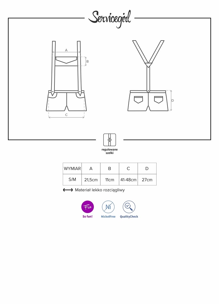 Сексуальный костюм Servicegirl, от европейского производителя Obsessive. Уникальный наряд официантки из придорожного кафе. Соблазнительные брюки с подтяжками, сделанные из черного, глянцевого материала. Гладкий карман между подтяжками скрывает грудь. Посадка регулируется на спине. Карманы на передней и задней части шорт добавляют игривости. Металлические кнопки на подтяжках изготовлены по технологии NickelFree (без использования вредного никеля). Яркий ободок для очаровательного взгляда. Качественные ткани и современные технологии производства.