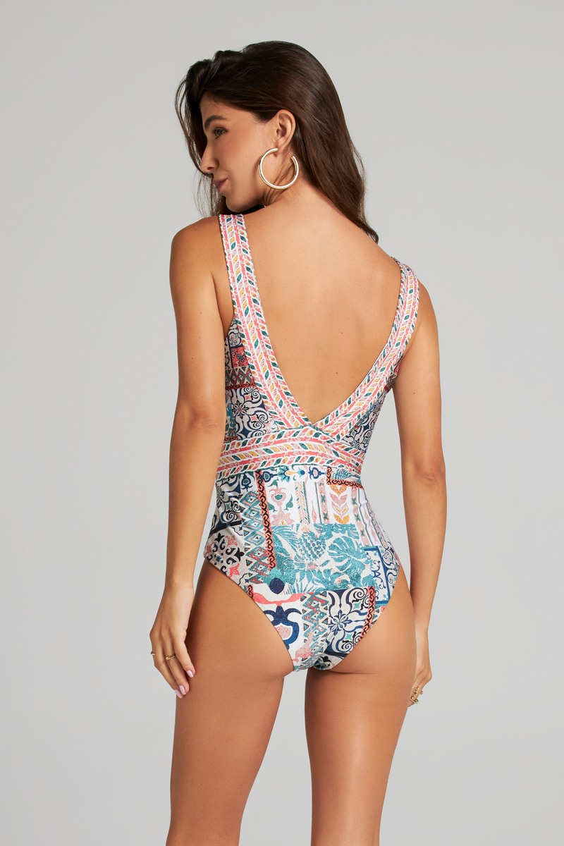 Купальник сплошной в стиле пэчворк от колумбийского бренда Cosita Linda. Модель выполнена из высококачественной ткани с эксклюзивными дизайнерскими аксессуарами ручной работы, на подкладе. Специальная вышивка на изделии из биссера и глубокий вырез со шнуровкой, чашки со съемными поролоновыми вкладышами для дополнительной поддержки. Трусики формы LATIN FIT. Бренд уделяет большое внимание защите природы, поэтому все свои изделия производит из современной переработанной эко ткани по технологии Less Water.