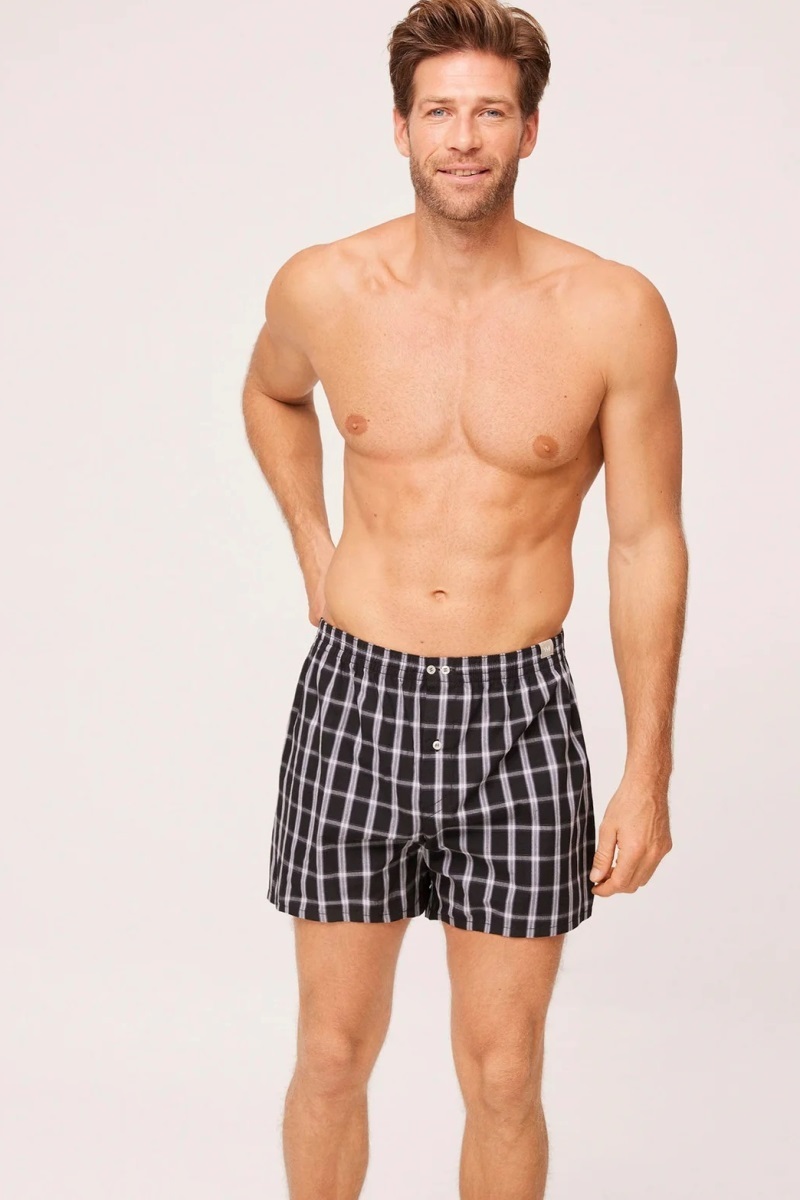 Свободные боксеры с гульфиком спереди и принтом в клетку. Изготовлен из 100% натурального хлопка.