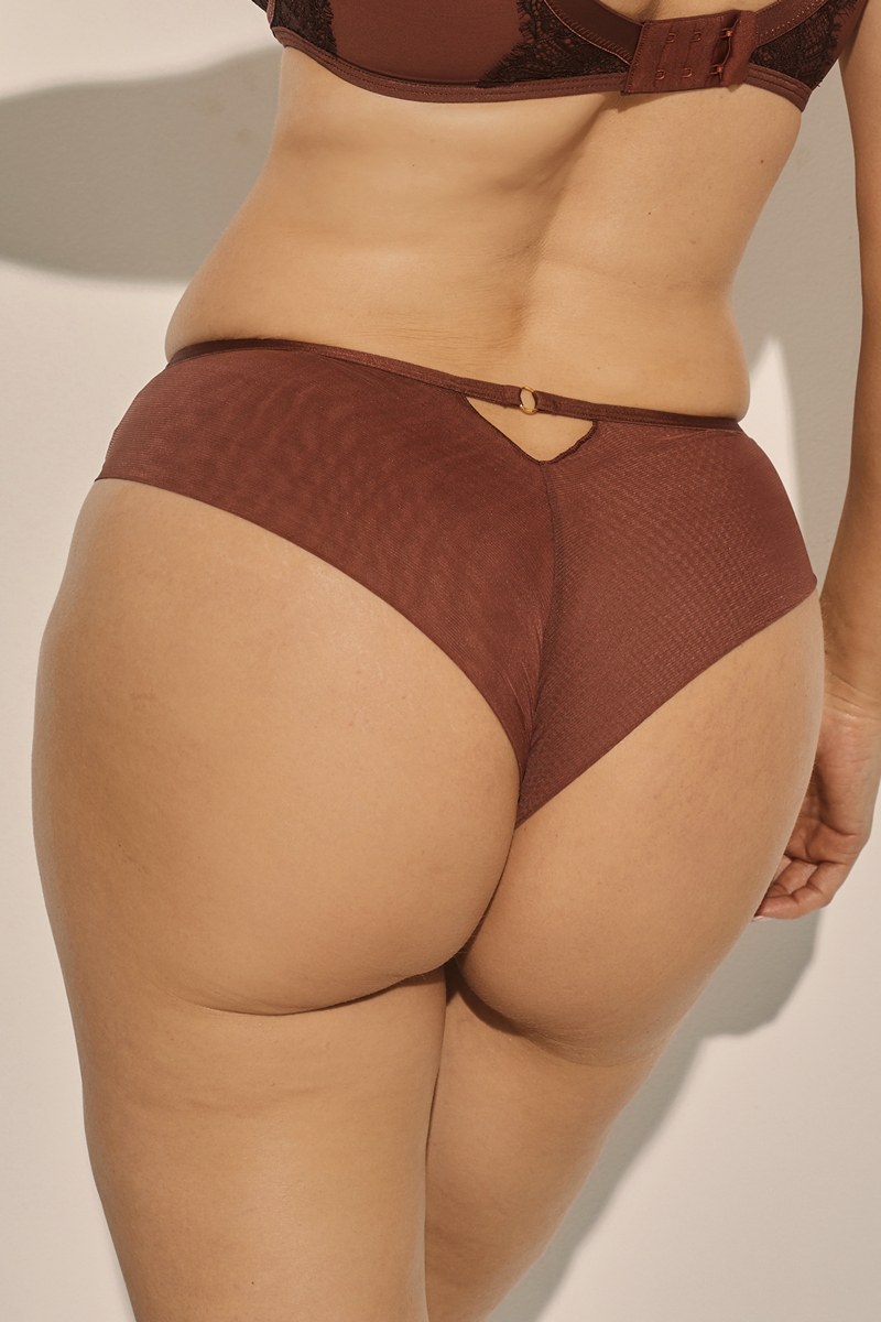 Трусы бразильяно PRALINE от европейского производителя Kinga. Спереди выполнены из кружева и микротюля, сзади из двойного микротюля. Ластовица хлопковая. Золотые аксессуары.