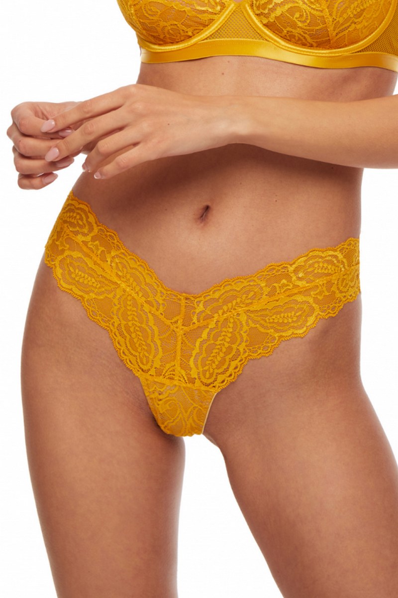 Элегантные трусики в энергичном желтом цвете 851/3-B от европейского производителя Kinga. Выполнены из нежного итальянского кружева. Фасон зрительно увеличивает ноги.