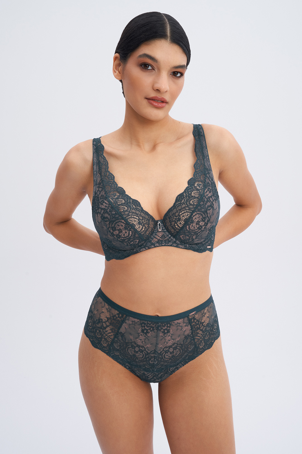 Высокие кружевные трусики-стринги Marea темно-зеленого цвета. Ластовица хлопковая.