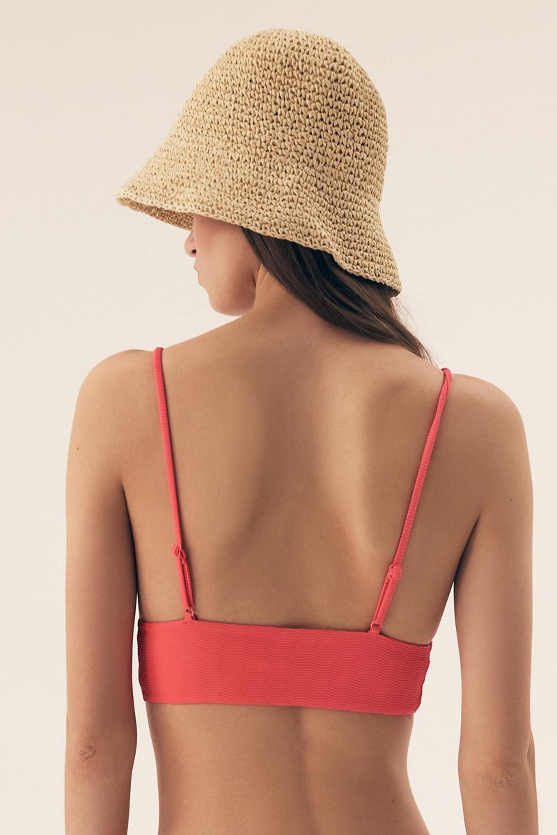Бюст купальный с чашкой из тонкого съемного поролона без кости. Чашки треугольной формы. Несъемные регулируемые бретели. Фактурная ткань. Подклад - 90% полиамид, 10% эластан.