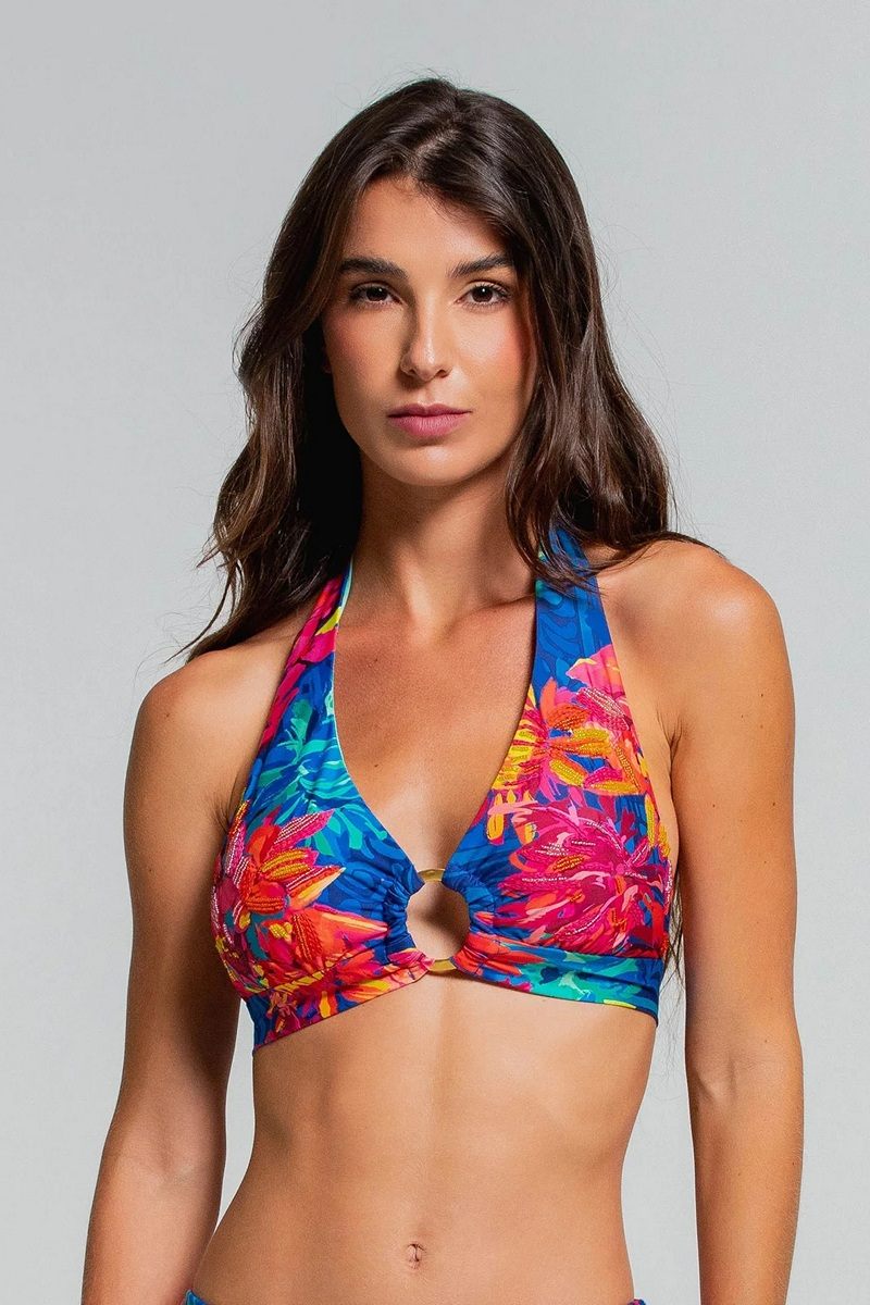 Бюст купальный от колумбийского бренда Cosita Linda. Бюст с бретелью халтер украшен вышивкой ручной работы и дополнен золотым кольцом в центре — эффектной деталью ручной работы. Благодаря съемному поролону в чашечках и поддерживающим бретелям он сочетает в себе элегантность и мастерство исполнения.