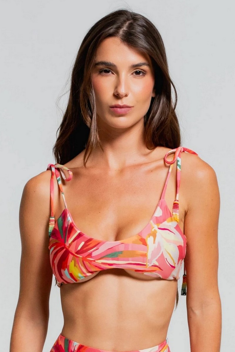 Бюст купальный от колумбийского бренда Cosita Linda. Изящный и женственный бюстгальтер на подкладе. Со съемной поролоновой чашкой, на завязках, которые декорированы на кончиках плетением из бисера. Этот стильный бюстгальтер красиво переливается на солнце и в лучах заката.