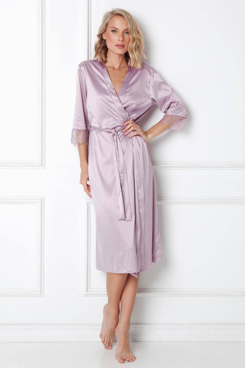 Элегантный и романтичный халат CELINE с рукавами 3/4 и нежным кружевом на манжетах. Халат из очень мягкой и эластичной атласной ткани, с атласными завязками внутри и поясом.