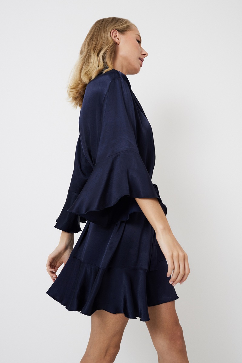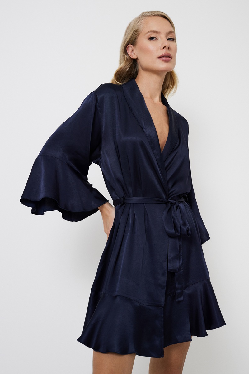Представляем вашему вниманию потрясающий халат Cressida — идеальное сочетание лёгкого комфорта и женственной элегантности. Этот халат из блестящей вискозы красиво драпируется и имеет насыщенный тёмно-синий цвет. Дизайн отличается слегка приспущенными плечами и широкими рукавами. Нежный бахромчатый край украшает рукава и нижний край, придавая изделию романтическое очарование. Независимо от того, отдыхаете ли вы после долгого дня или наслаждаетесь спокойным утром, халат Cressida — это изящный и стильный способ расслабиться. Насладитесь непревзойденной ночной роскошью с помощью этого изысканного изделия.