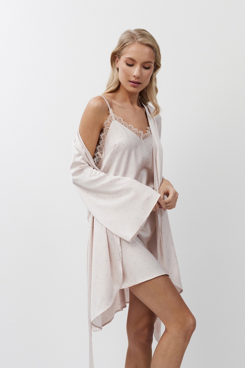 Короткий нежный женский халат GWEN для вашего комфорта. Халат выполнена из шелковистого сатина, на поясе, с закругленным низом, рукава свободные, V-образный верез декольте. Расслабьтесь с максимальным комфортом в халате GWEN.