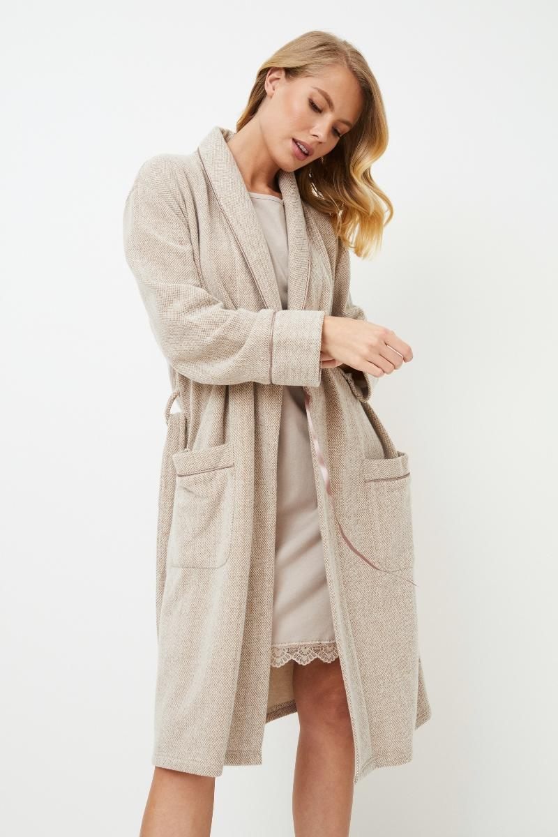 Представляем вашему вниманию халат Marianna, который станет вашим уютным спутником для стильного времяпрепровождения! Длинные рукава и длина выше колен создают ощущение теплых объятий вашего любимого плюшевого мишки. Этот светло-коричневый халат с завязками для плотного прилегания и удобными карманами - ваш верный путь к полному расслаблению. А для придания элегантности вырез украшен изящной окантовкой. Так что вперед, укутывайтесь и наслаждайтесь заслуженным комфортом в халате Marianna!