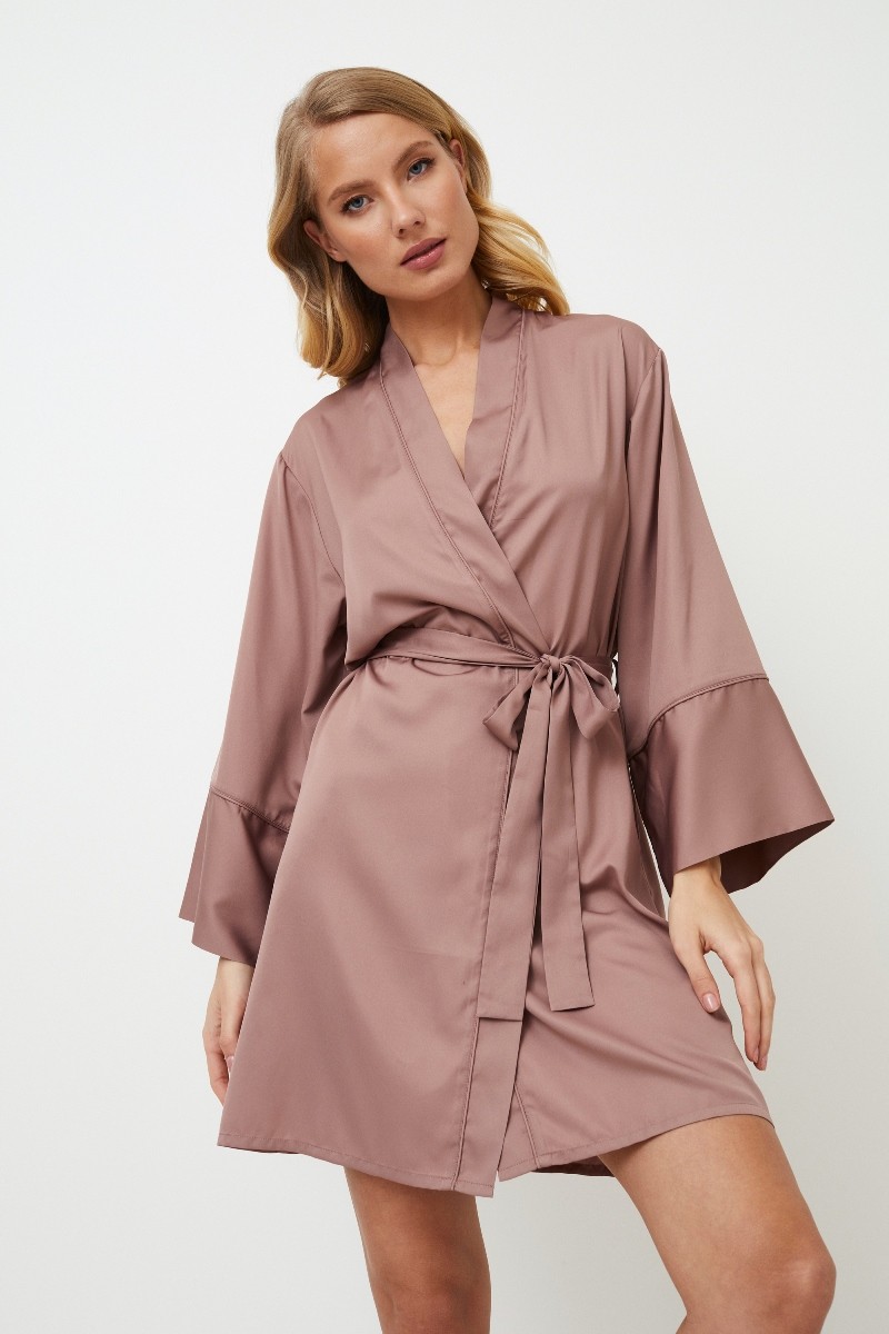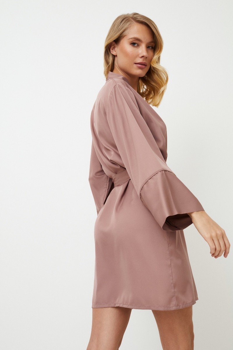 Платье Primrose с широкими длинными рукавами и завязкой на талии для удобной посадки выполнено в стильном оттенке пыльно-розовой розы. Спереди и на манжетах рукавов оно украшено кантом того же цвета. Оно сшито из легкой ткани и роскошно на ощупь, поэтому идеально подходит для ношения круглый год. Благодаря шикарному крою длиной выше колена, это универсальное платье можно надеть поверх пижамы Primrose или ночной рубашки Primrose, создавая идеальный уютный ансамбль.