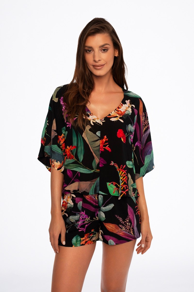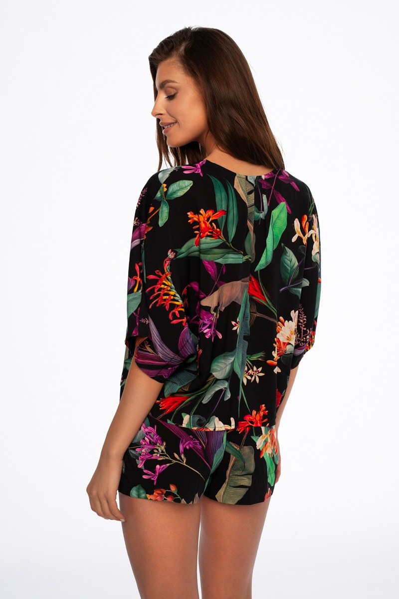 Вискозная женская пижама с шортами. Футболка с коротким рукавом, шорты с поясом на эластичной резинке. Принт цветочный.