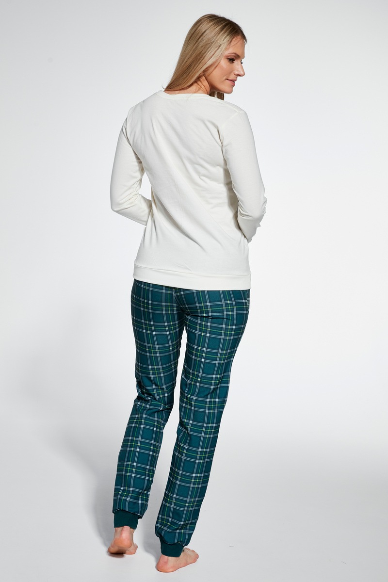 Хлопковая женская пижама. Футболка с длинным рукавом, круглый вырез, передняя часть украшена праздничным забавным принтом. Длинные брюки с манжетами, эластичный пояс.