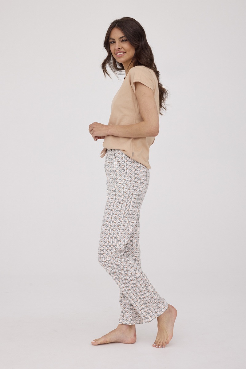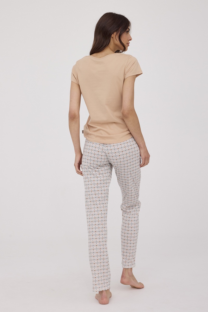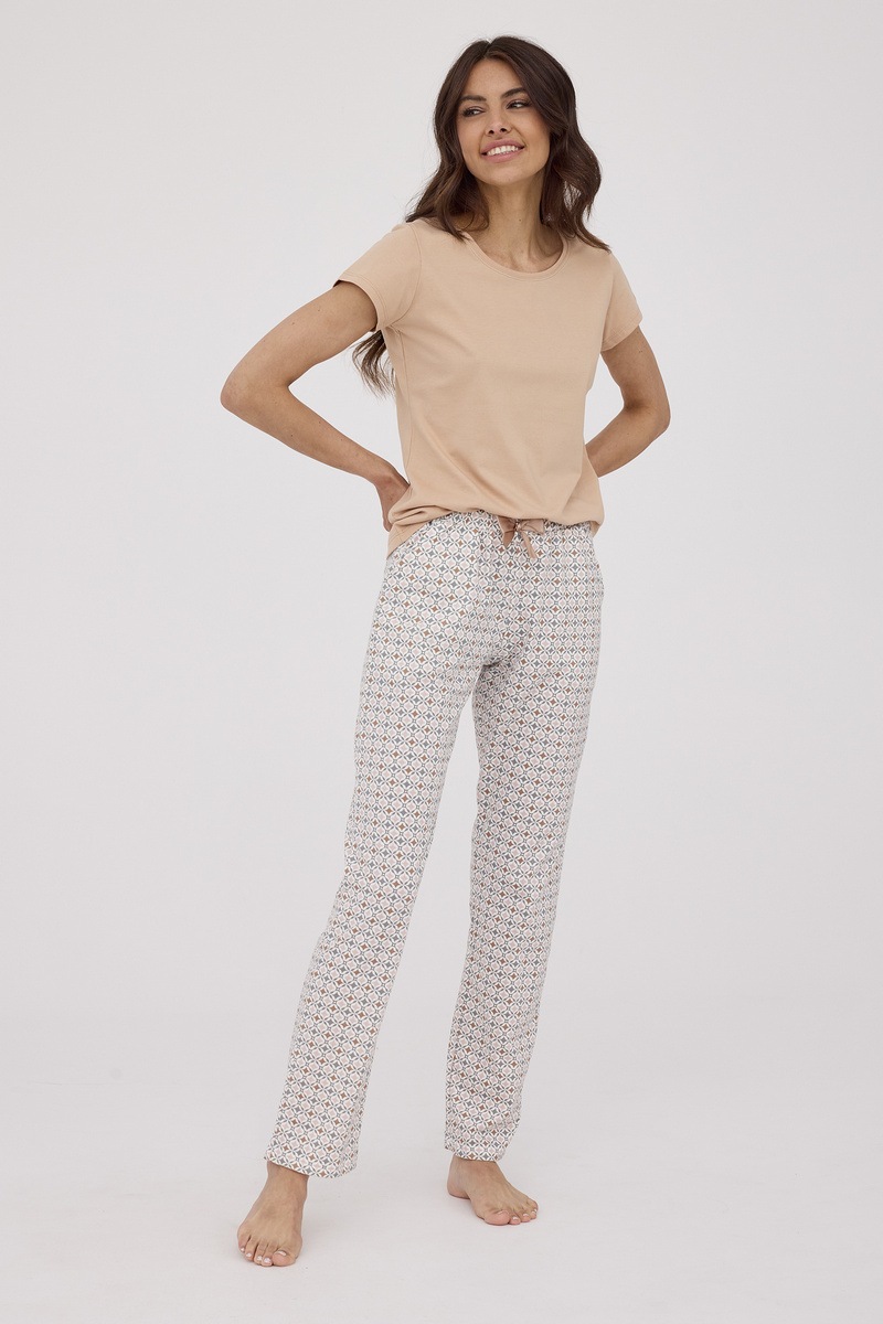 Женская пижама BONNIE от европейского производителя Cornette. Изделие из высококачественного хлопка с однотонной футболкой и узорными брюками.