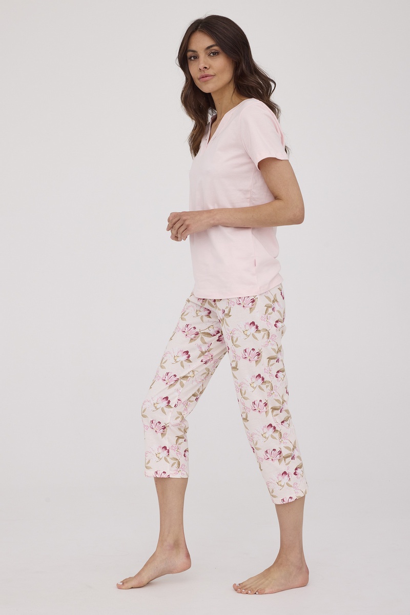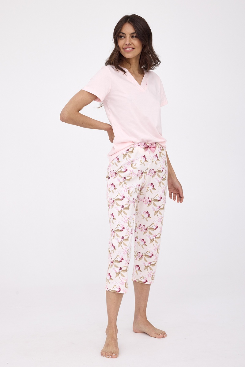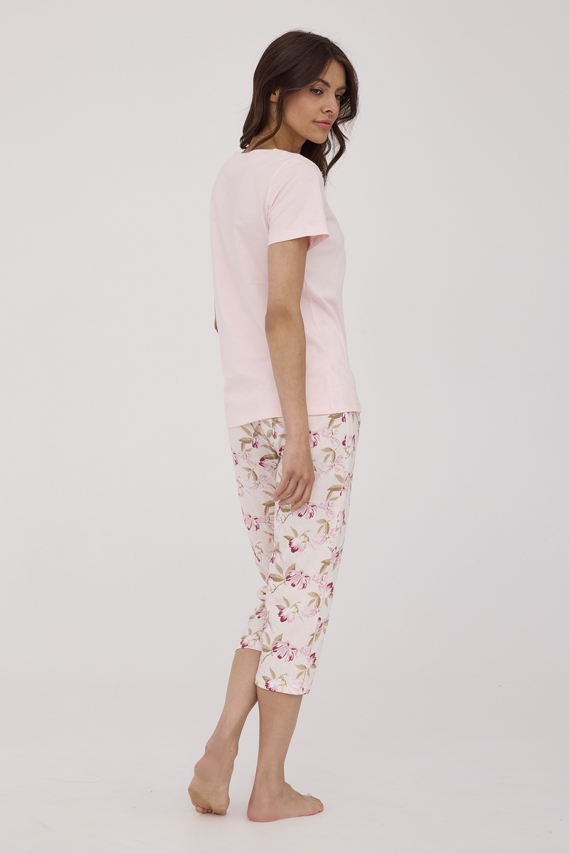 Женская пижама ABBY от европейского производителя Cornette. Изделие из высококачественного хлопка с однотонной футболкой и узорными брюками, длиной 7/8.