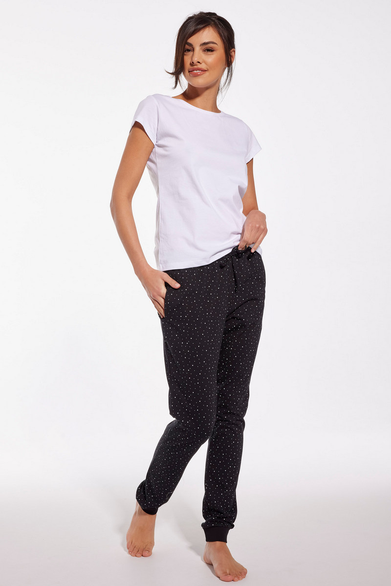 Женские домашние трикотажные брюки на резинке и с завязками. Прямой свободный крой не сковывает движений. В боковых швах находятся карманы.